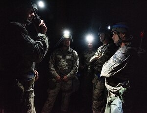Aug. 6, 2018 Mobility Exercise 2018 Senior Airman Max Shumate, 375th Civil Engineer Squadron structural journeyman, uses a hand-held radio to get direction from his leadership during a base exercise, Aug. 1, 2018, at Scott Air Force Base, Illinois. Shumate was part of a group of 375th CES Airmen responsible for responding to several