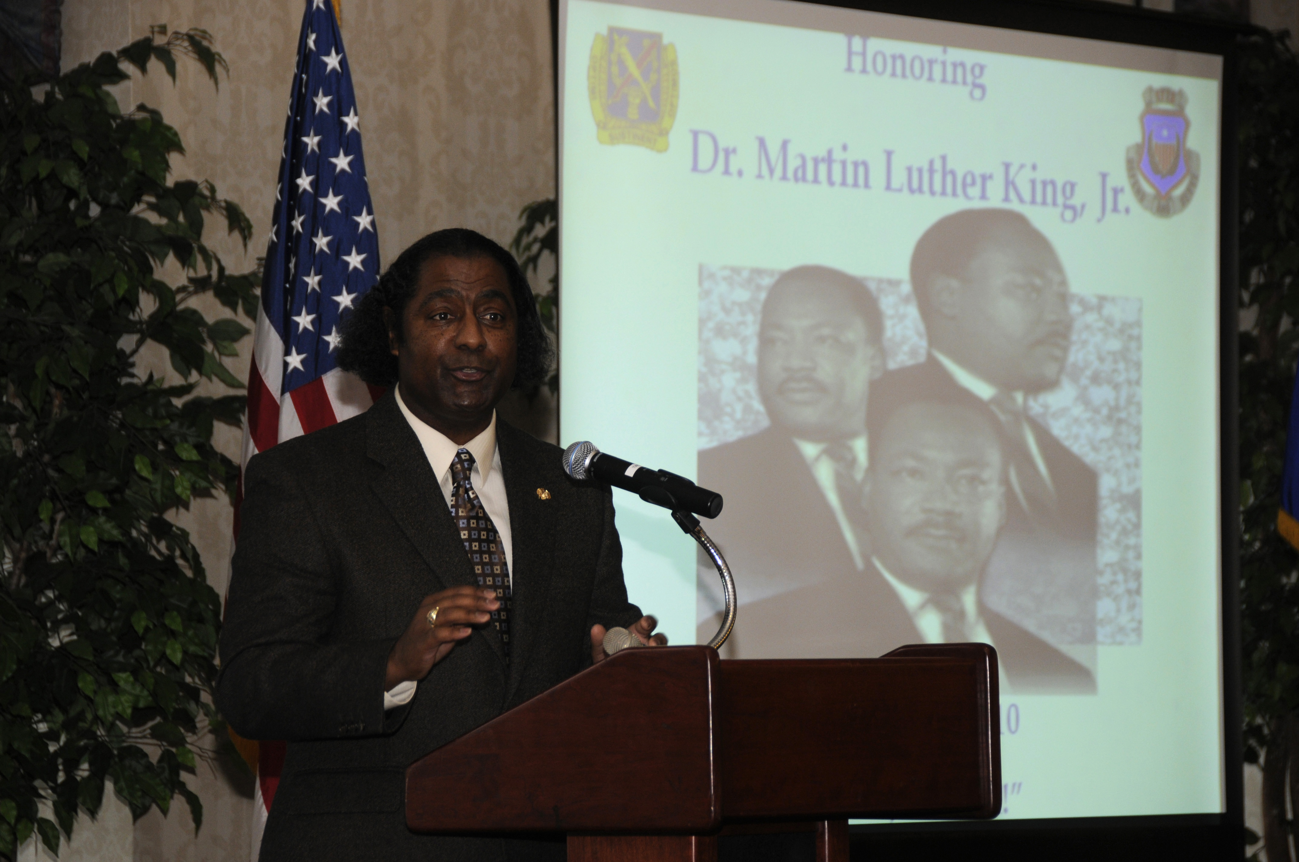 SCOTT AIR FORCE BASE, Ill. -- Retired Command Chief Master Sgt. Bobby Dandringe speaks at a luncheon in honor of Dr. Martin Luther King Jr. at the Scott Club Jan. 20. Chief Dandringe spoke of the many accomplishments that have resulted from Dr. King’s efforts. The event culminated with a slide show and Tech. Sgt. Albert Williams singing “America the Beautiful.” (U.S. Air Force photo/Staff Sgt. Brian Ellis)