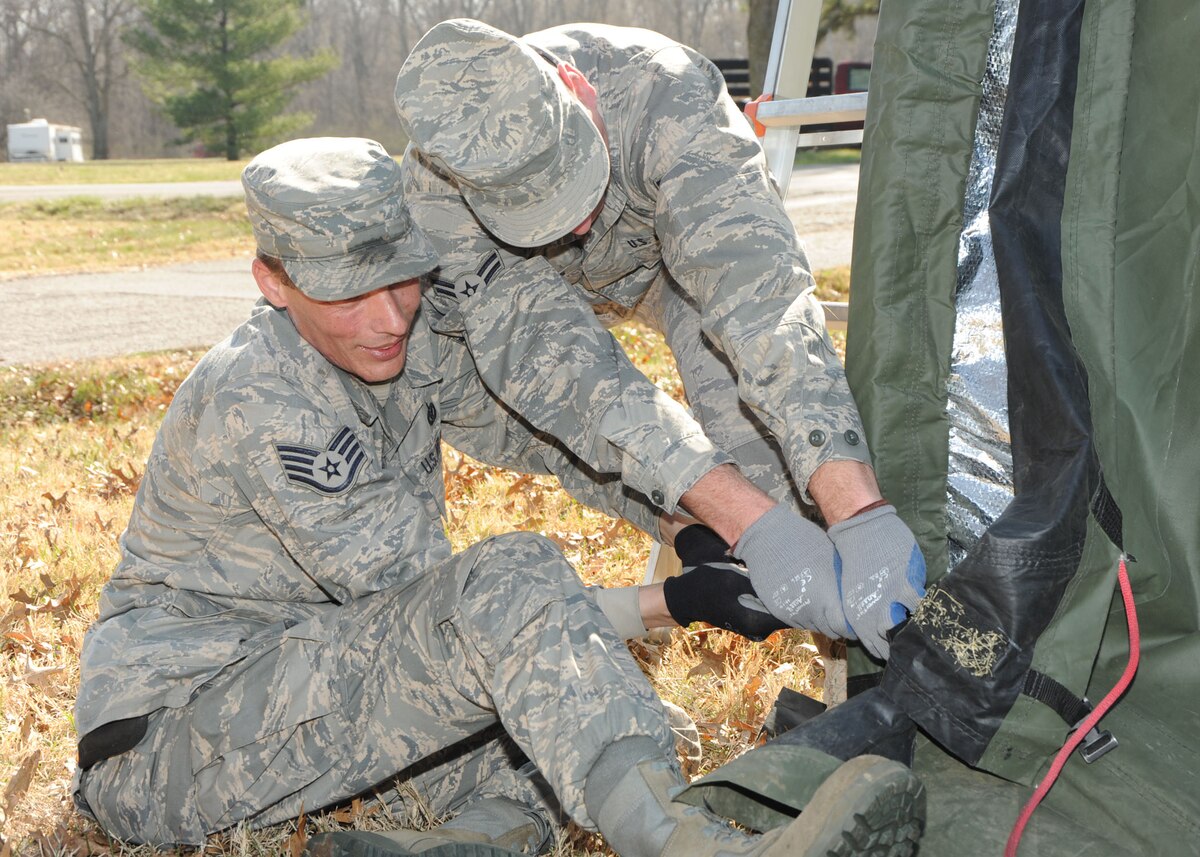 Scott uses exercise to train for deployments Published March 25, 2009 By Airman 1st Class Amber Kelly-Woodward 375th Airlift Wing Public Affairs SCOTT AIR FORCE BASE, Ill. -- The 375th Airlift Wing initiated a mobility exercise March 17-19 to practice deploying combat-ready Airmen to a forward location. More 300 airman got their bags ready to go while the 375th Logistics Readiness Squadron and 375th Military Personnel Flight worked to get them processed and where they needed to be. "The point of this exercise was to test our mobility capability - to see how fast we can notify someone about a deployment, prepare them for a deployment and refresh their war skills and ability to survive and operate in a deployed environment," said Lt. Col. Jimmie Meek, 375th Airlift Wing deputy exercise evaluation team chief. The first step for the travelling Airmen was the 375th LRS building where they processed through a mobility line. Everything was consolidated into a one-stop shop to make the process more time efficient. "The mobility line gives the deployers an understanding of what's expected and that they need to keep their records up to date," said Senior Master Sgt. Ricki Hennington, 375th MPF superintendent. "This exercise benefits the deployers the most, but it also benefits the people involved of the process because they get the exposure for what could happen if this were a real world situation," he added. After going through the mobility line, the Airmen were brought to a simulated deployed environment where they put their skills of self-aid buddy care, post-attack recovery procedures, steps to follow in the event of an unexploded ordinance found, how to engage in combat arms effectively, how to go through a decontamination line and how to prepare living quarters in a deployed location to use. "We created a realistic training environment that did not just teach them things that they already know, but fine tuned them as well," said Master Sgt. Mark Major, 375th Medical Group Independent Duty Medical Technician program manager. "We could teach this in a classroom, but it's not as effective as going into the field. This way they see how they will actually use the skills in a deployed environment." This exercise is just one of many to come in preparation for the Operational Readiness Inspection in March 2010. Three exercises will include Airmen flying to Michigan and Mississippi to further enhance their training and better prepare Airmen for deployments. Tech. Sgt. David DeRemer and Airman 1st Class Benjamin Burk contributed to this article