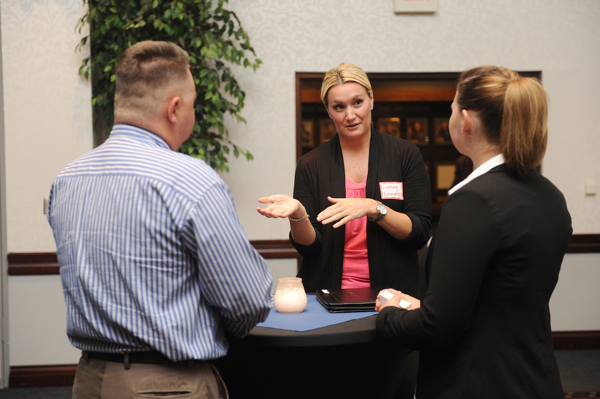 Networking night held at Scott Club Published Sept. 29, 2014 By Staff Sgt. Maria Bowman 375th Air Mobility Command Public Affairs SCOTT AIR FORCE BASE, Ill. -- Airmen preparing to transition into the civilian workforce were invited to attend a networking event held at the Scott Club Sept. 25. Dressed in business professional attire, 100 Airmen met with prospective employers from the local area, who were hoping to hire veterans. "The purpose of the networking event was to get as many of our Airmen connected to businesses that have job openings," said Ellen Krohn, Leadership Council Southwestern Illinois executive director. "The people who are exiting the base have the skills that our employers are looking for; they know how to show up on time and do the things that make a business successful. We want those Airmen to continue to be part of fabric of Southwestern Illinois." Victor Valdes, a local employer, said he felt the event was successful because he was able to meet with many skilled candidates. "I think it went great and was well worth the time," he said. "There was a lot of interaction between myself and the candidates. They were very well presented." Sandra Grossman, a military spouse, attended the event and said she feels that the event helped introduce her to companies she would love to work for in the future. "I really enjoyed the event and it was very helpful," she said. "I actually got to talk to people from companies I applied to before. Being able to talk to them in person, I think I actually have such better chances to even being considered for a job." Krohn said she hopes the event matched up military members with employers looking for their skills. The goal of the event was to facilitate employment in the region for as many Team Scott members as possible. "If we can find a job for everyone who wants to stay here by making these connections--we think that's a positive thing for the whole region," she said.