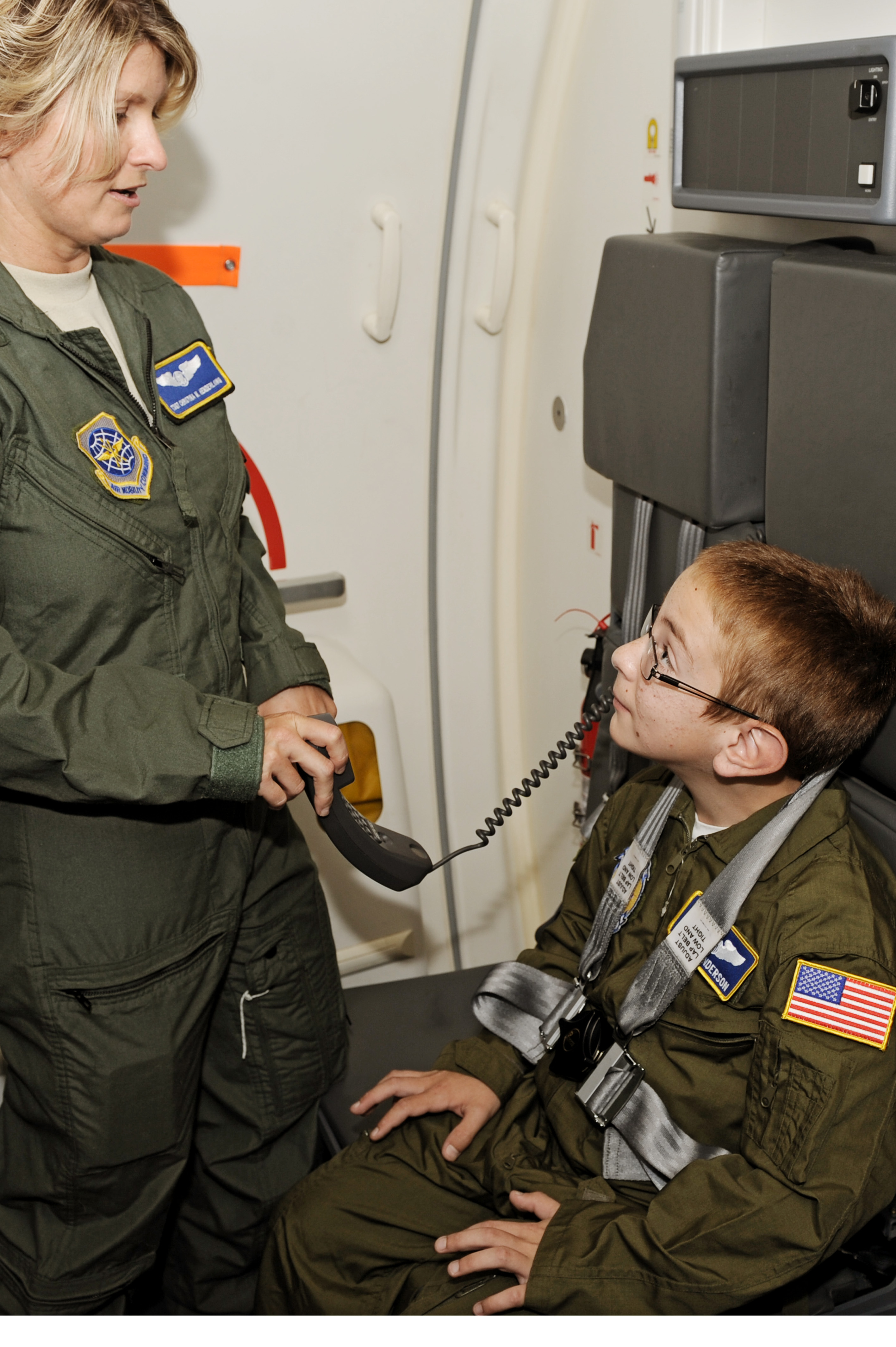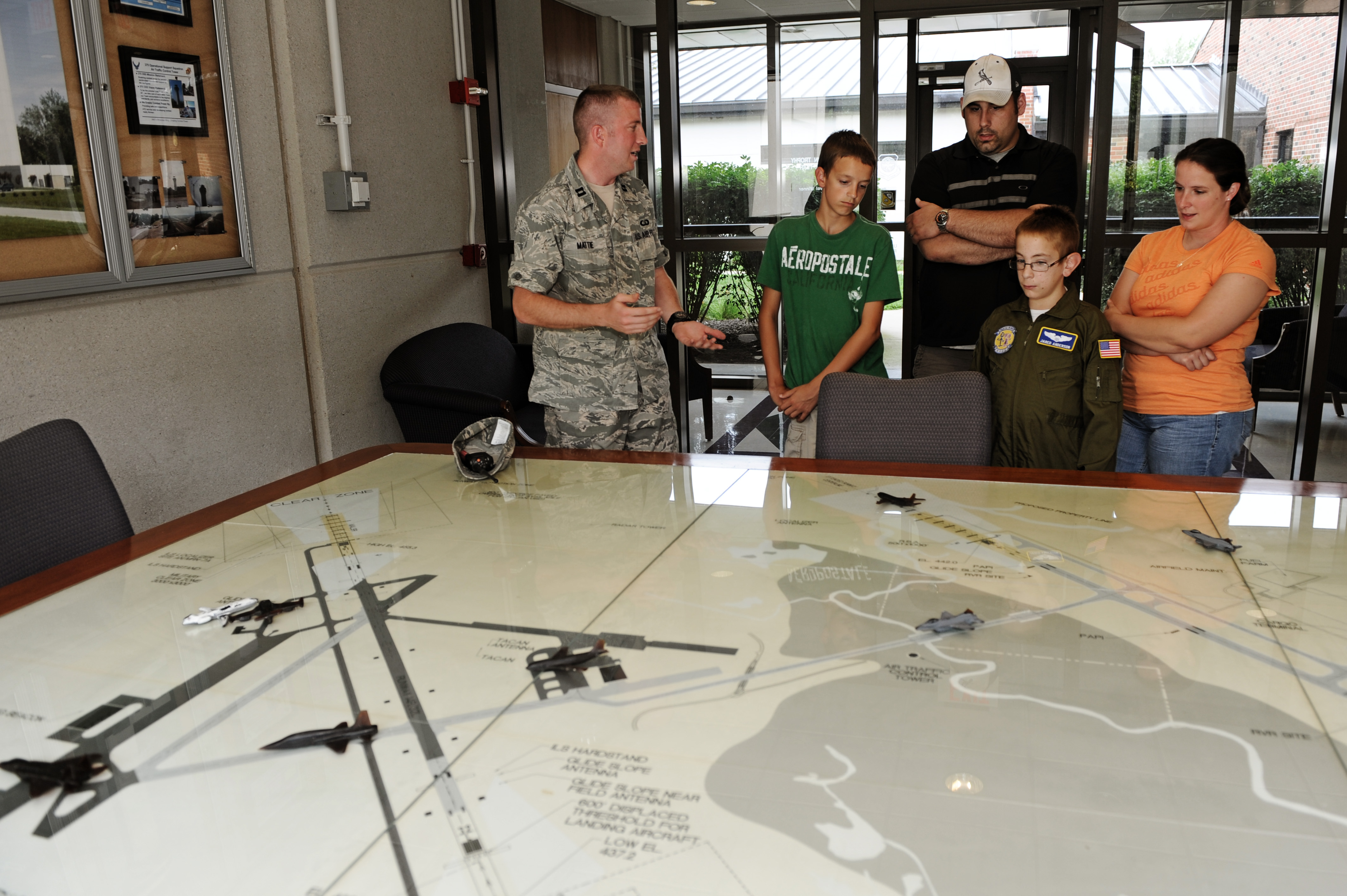 Capt. Kyle Mattie, 375th Operation Support Squadron, explains to Jared Anderson and his family how air traffic controllers were trained prior to using a flight simulator during his visit for the Pilot for a Day program July 7, 2011 at Scott Air Force Base, Ill. Jared, who is diagnosed with chronic kidney disease, was nominated to come to Scott and be a pilot for a day. The program gives seriously ill children a close up look at the Air Force. His day consisted of multiple events and tours to include a C-21A taxi ride, a military working dog demonstration, fire department demonstration, and a ride in a flight simulator. (U.S. Air Force photo/Staff Sgt. Brian J. Valencia)