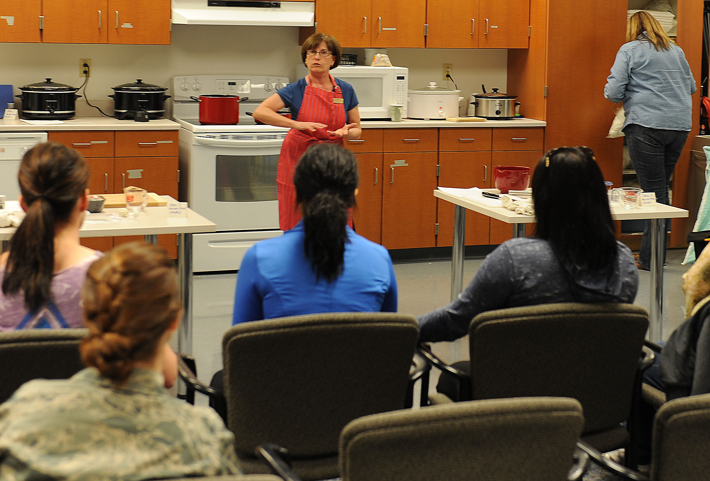 Kathy Steinbrecher, Health and Wellness Center health promotion dietitian, teaches a cooking class at the Airman and Family Readiness Center March 8. The Foodie Friday cooking class showed participants how to use a slow cooker to prepare meals using budget-friendly cuts of meat and poultry. The class learned three healthy recipes. (U.S. Air Force photo/Staff Sgt. Maria Bowman)