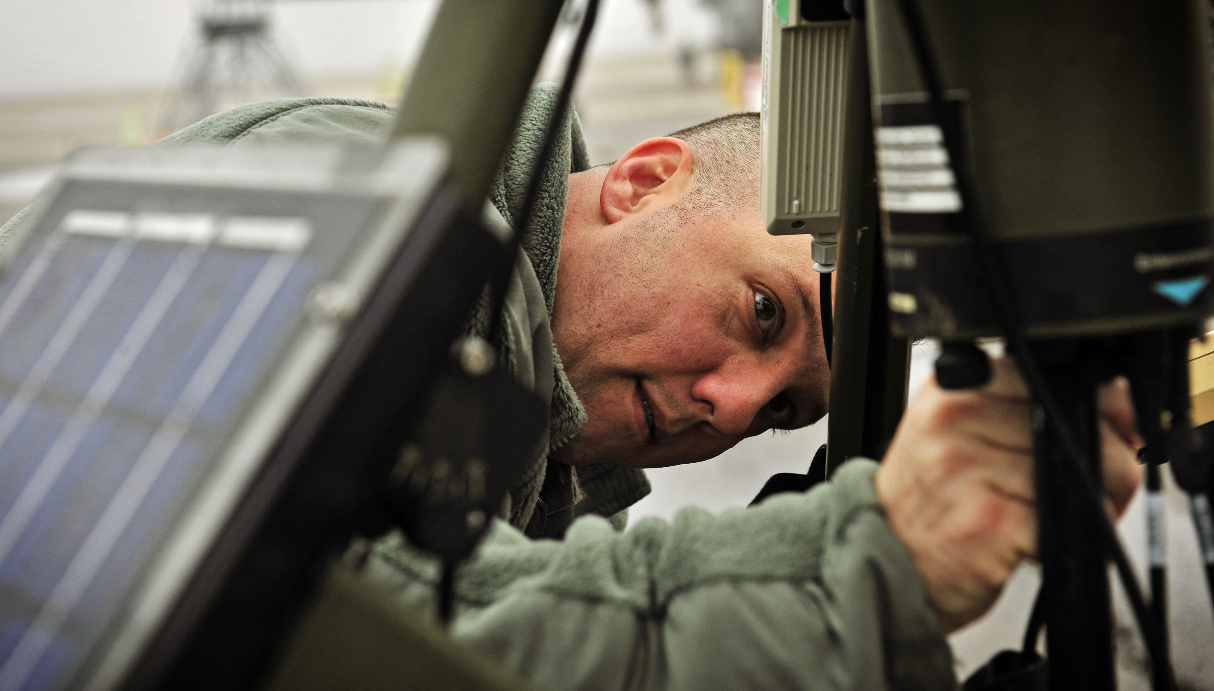 Master Sgt. Christopher Dunstone, 375th Operations Support Squadron weather specialist, sets up a mobile weather sensor during an Operational Readiness Exercise at the Mississippi Air National Guard's Combat Readiness Training Center Gulfport in Gulfport, Miss., Jan. 15, 2013. The 134th AEW is comprised of four units: the 153rd Airlift Wing, the 130th Airlift Wing, the 375th Air Mobility Wing and the 11th Wing. The exercise assesses the abilities of the individual units to deploy forces, quickly respond and recover assets during a weeklong exercise conducted and graded by an Exercise Evaluation (U.S. Air Force photo/ Staff Sgt. Ryan Crane)