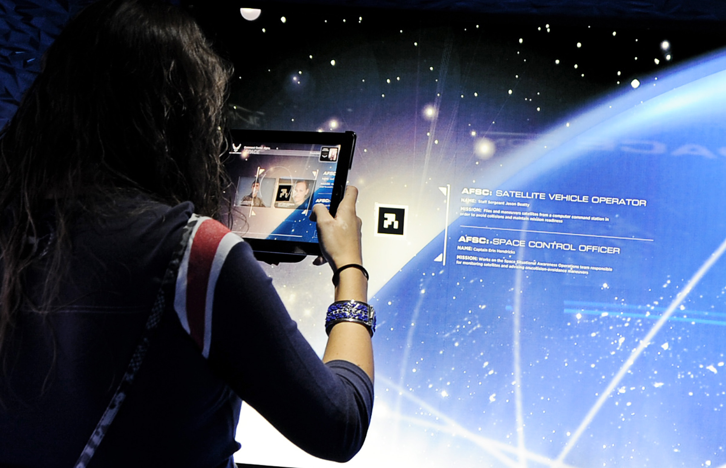 Air show spectators take a look in the Air Force recruiting Command Center Alpha during 2012 Airpower Over the Midwest air show Sept. 16 at Scott Air Force Base, Ill. The Command Center Alpha allowed individuals to gain knowledge of the Air Force by checking out an iPad that could be used to scan barcoded areas that would unlock videos, information and games about the AF mission. (U.S. Air Force photo/ Staff Sgt. Brian J. Valencia)