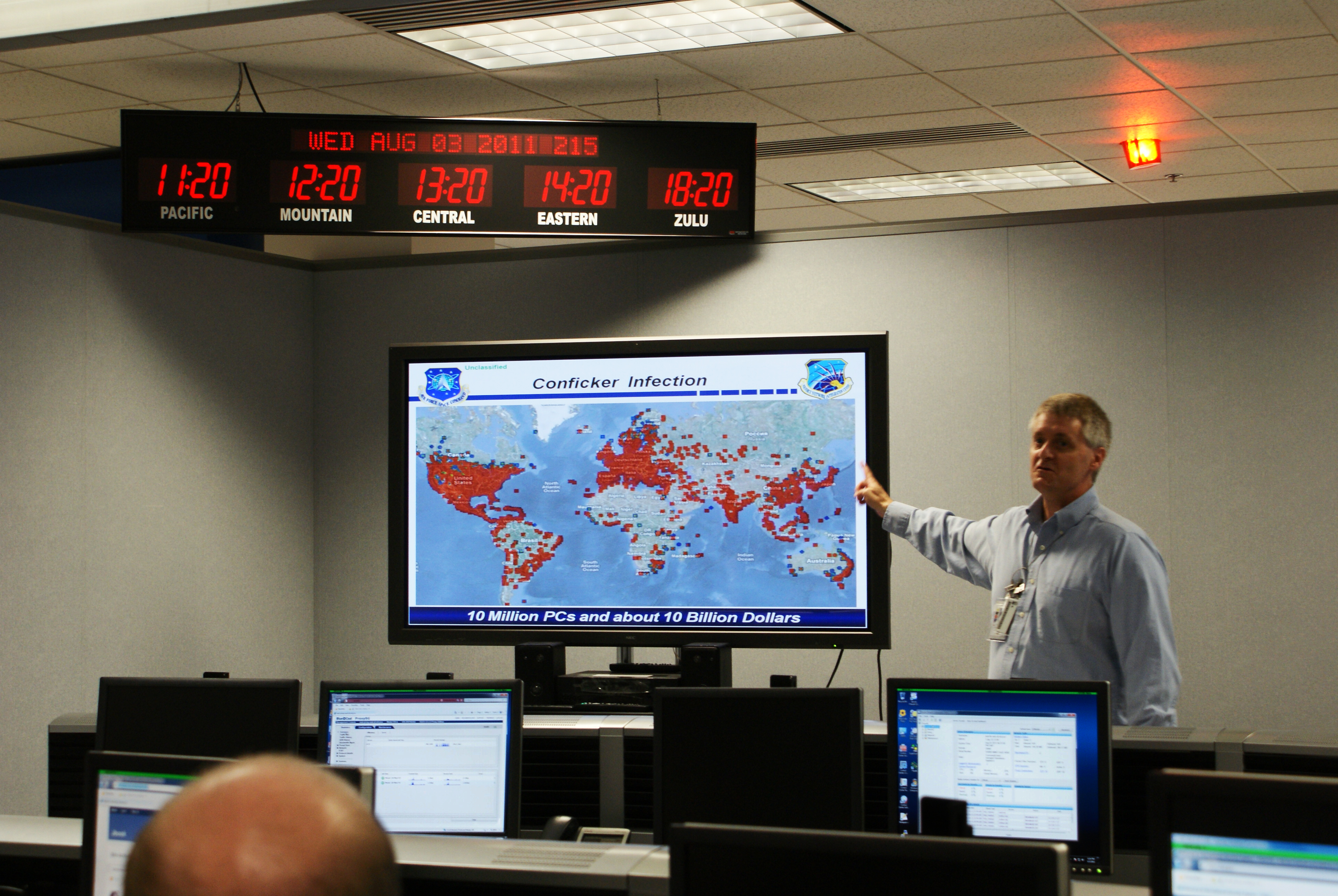 Tom May, Air Force Network Integration Center, briefs a group about how the Simulator Training Exercise (SIMTEX) helps prepare Air Force’s cyber warriors to respond to devastating cyber threats in AFNIC’s Technology and Interoperability Facility Aug. 3 at Scott. The SIMTEX training range closely models the Air Force’s three-tiered network operations and security structure, giving cyber warriors valuable hand-on experience within a safe, secure environment. (U.S. Air Force photo/Travis Nuckolls)