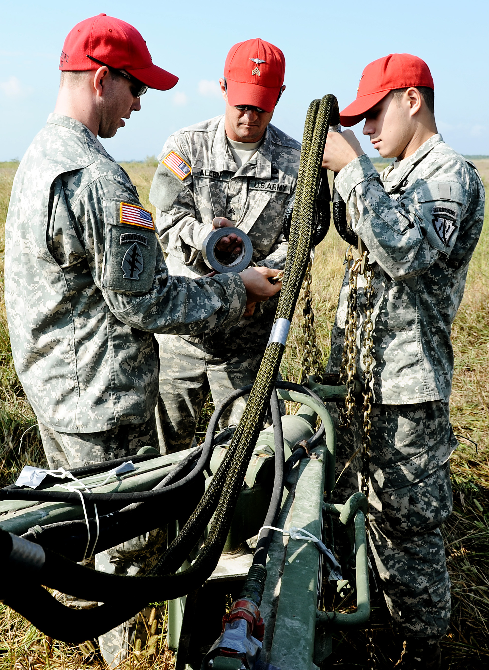 Indiana Air National Guard's 165th Quartermaster Company members secure an M-149 water buffalo during sling load training Sept. 11, 2011 at Sparta Training Area, Sparta Ill. Joint team members from the Air Force, Army, Navy and Marines all participated in the training that centered around sling loading, cargo air drops and medical evacuation training. (U.S. Air Force photo/ Staff Sgt. Brian J. Valencia)
