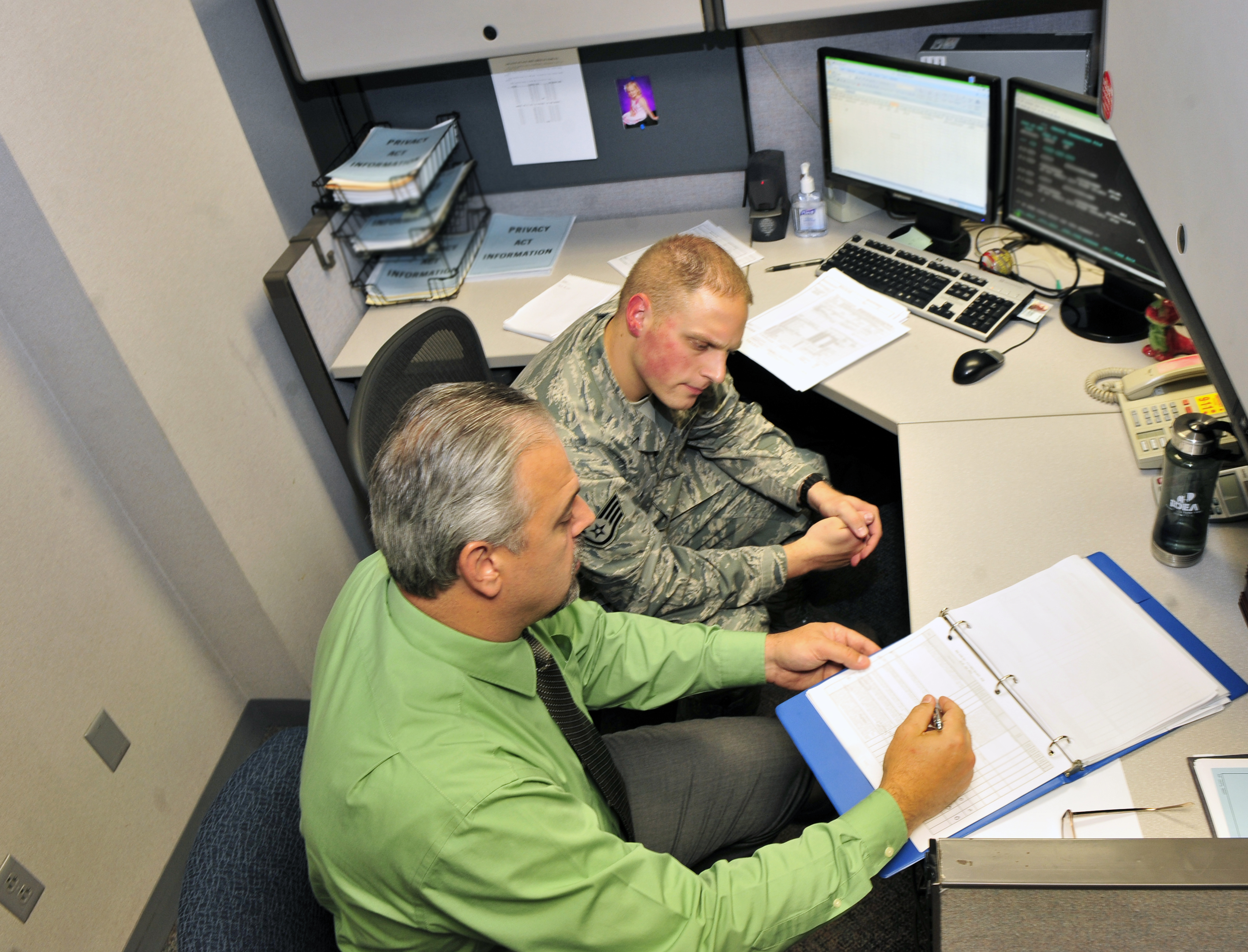 SSgt Justin Ellrich, 375th Comptroller Squadron, NCOIC Special Actions, is inspected by Mr. David Akemon during the Combine Unit Inspection Aug 23, 2011 on Scott Air Force Base, Ill. The CUI began on Aug. 22 and will end on the 26. (U.S. Air Force photo, Staff Sgt. Stephenie Wade)