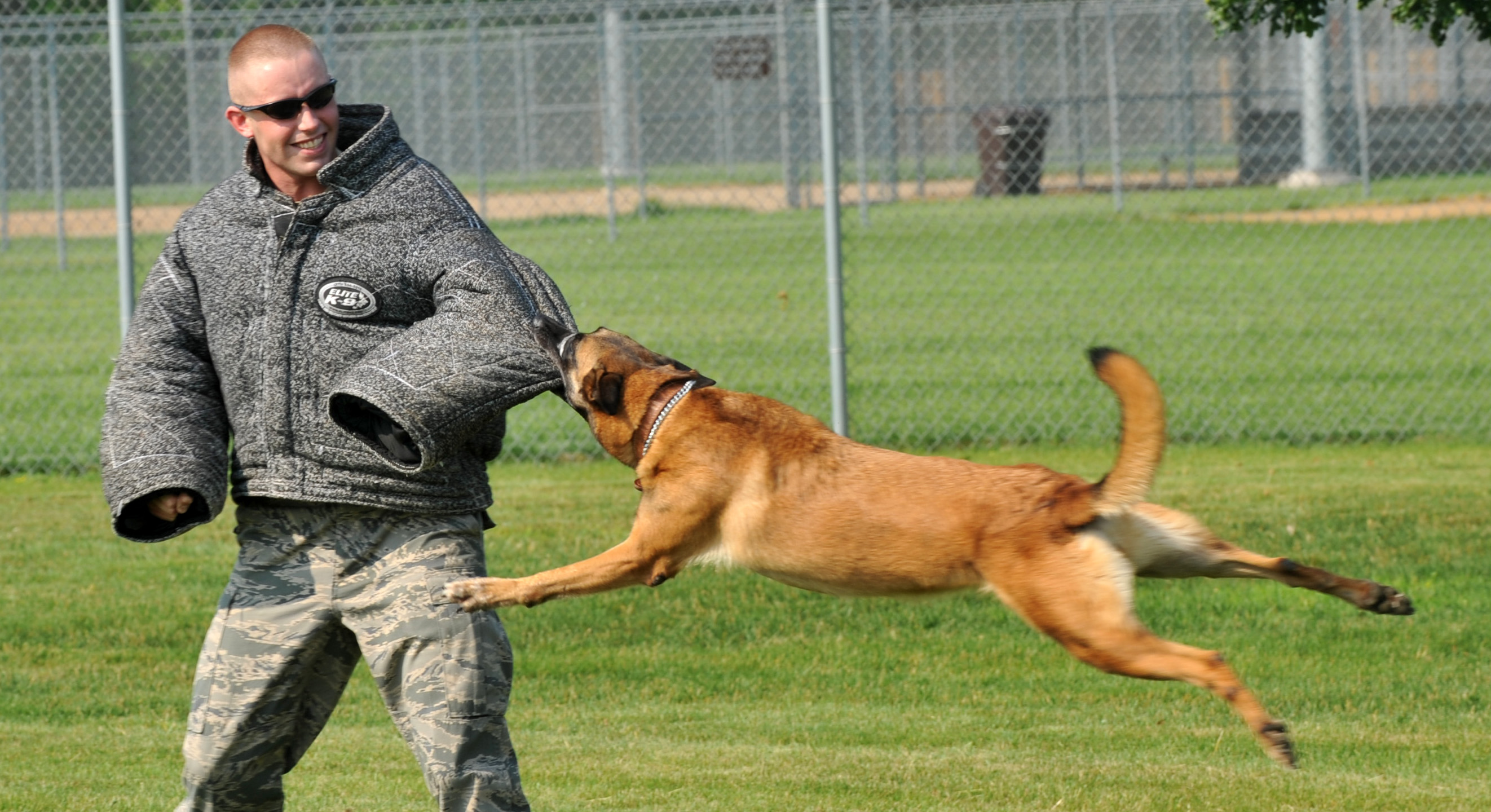 Staff Sgt. Joel Brooks and military working dog Tilly, both from the 375th Security Forces Squadron, demonstrate how a military working dog attacks terrorist June 6, 2011 at Scott Air Force Base, Ill. More than 12 organizations on base will open their door June 6-8 for tours and demonstrations. (U.S. Air Force photo/ Airman 1st Class Divine Cox)