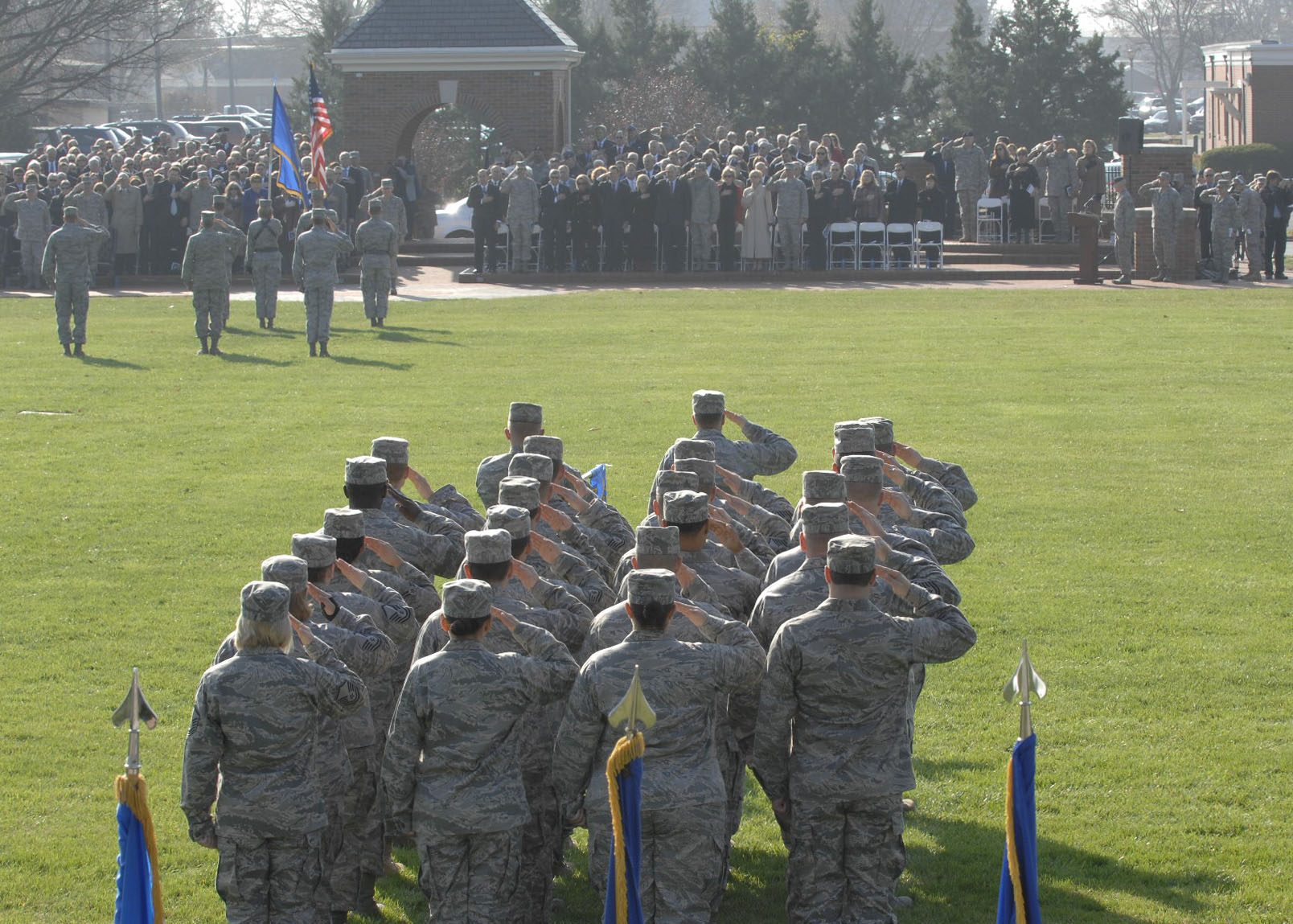 SCOTT AIR FORCE BASE, Ill -- Military personel render a salute to the flag during the national anthem before General Authur J. Lichte’s retirement ceremony and the AMC change of command, Nov. 20 on Scott Air Force Base, Ill. General Lichte will be retiring after 38 years of dedicated service to his country. (U.S. Air Force photo by Airman First Class Tristin English)
