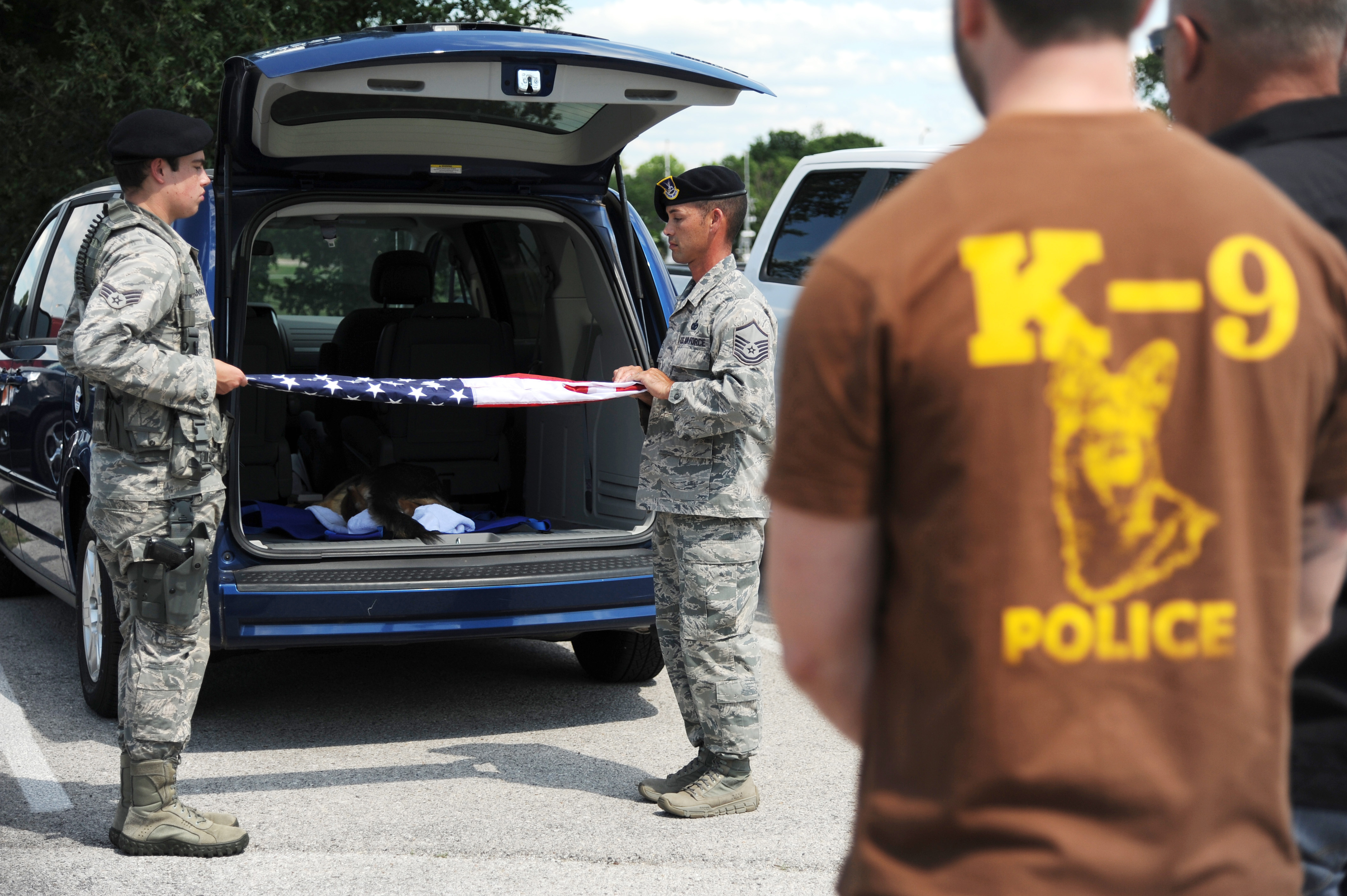 375 Security Forces members fold the flag for Military working dog Brix July 18, 2014 at Scott Air Force Base, Ill. Brix was put to rest after his health took a turn for the worse when he started having hip problems. Brix was awarded a Navy Marine Corp Achievement medal and an Army Commendation medal while being deployed in Iraq. He retired in 2011 upon returning from a deployment. (U.S Air Force photo/ Senior Airman Tristin English)