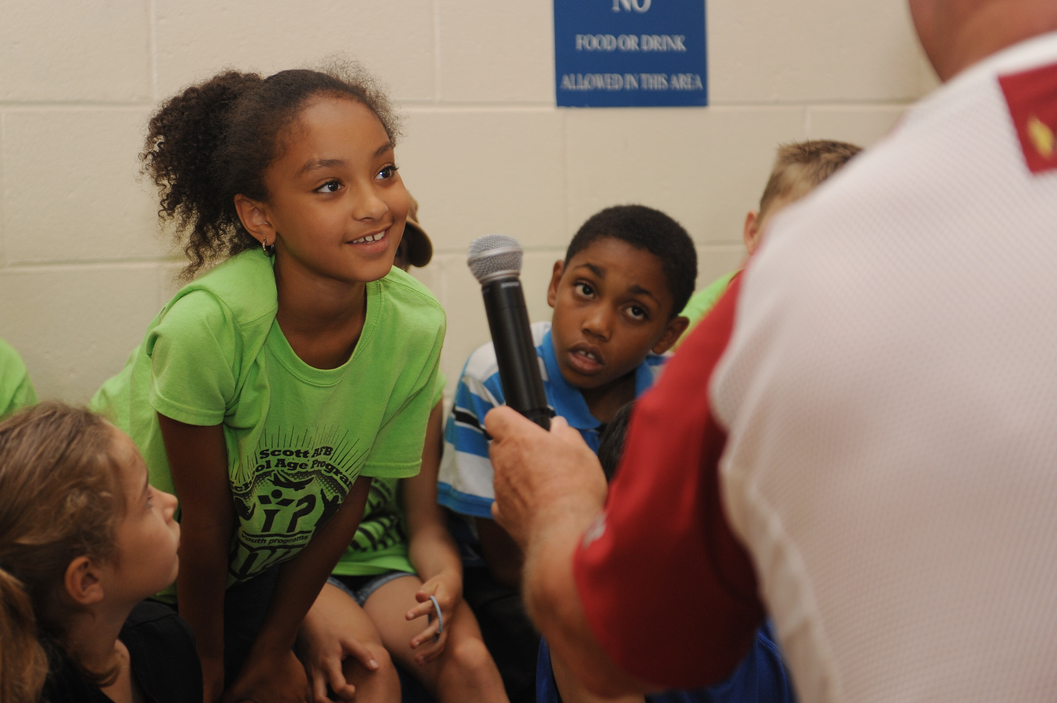 Ed Cockrell displays his leg during his motivational speech at the closing ceremony of the 2014 Olympic Celebration at the Youth Center at Scott Air Force Base, Ill., June 19, 2014. During the speech, Cockrell talked about being in the Olympics and the importance of competition. Afterwards, he answered questions from audience members. Cockrell won the silver medal in the shot put competition in Athens, Greece in 2004. (U.S. Air Force photo by Staff Sgt. Maria Bowman)