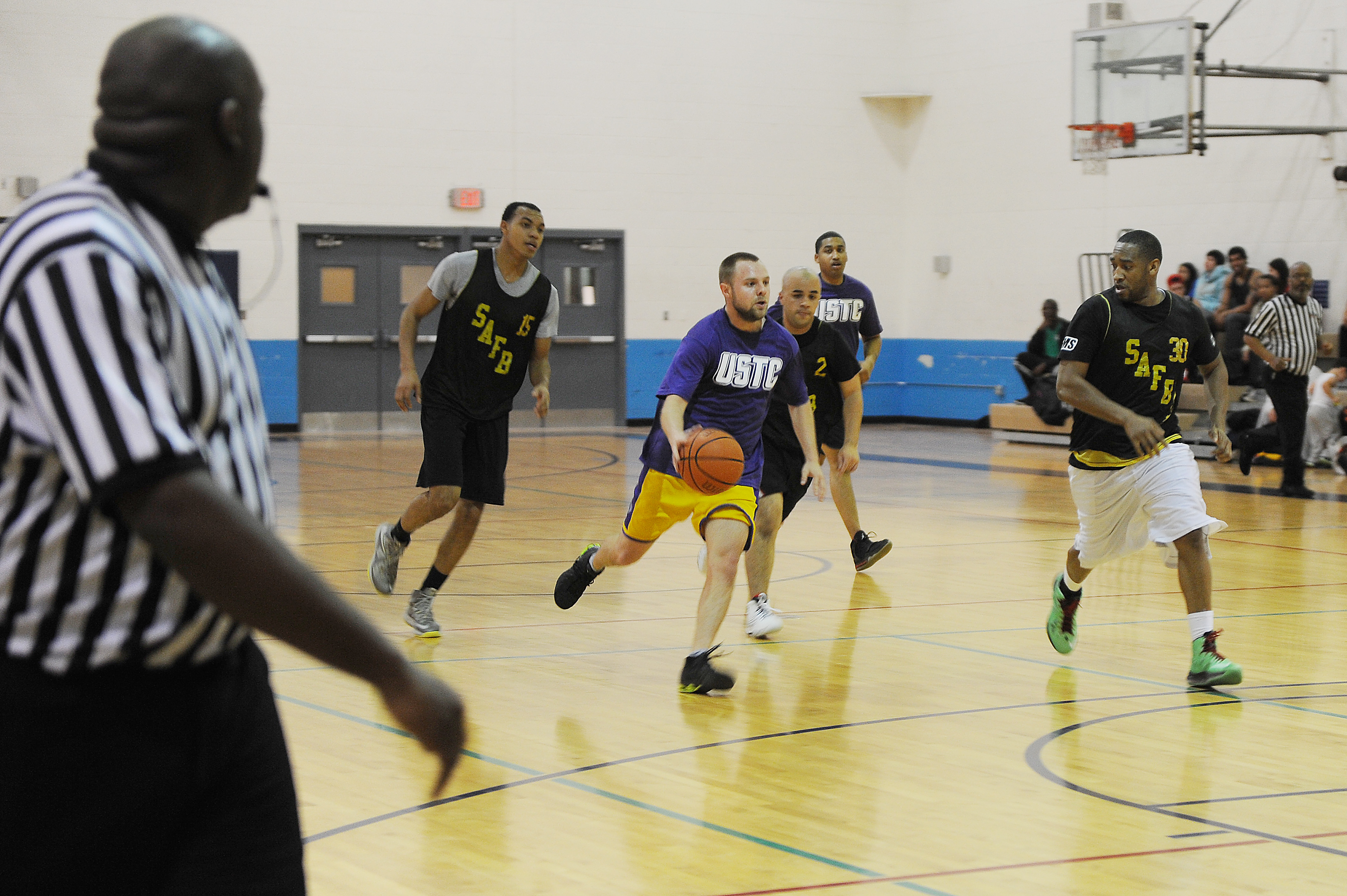Jared Thouvenot drives to the basket past a defender from the 375th Force Support Squadron during an intramural basketball game Jan. 22, 2014, Scott Air Force Base, Ill. Thouvenot plays for the United States Transportation Command basketball team who is currently 7-1 after beat FSS 85-42. (U.S) Air Force photo/ Master Sgt. Marcelo Joniaux)