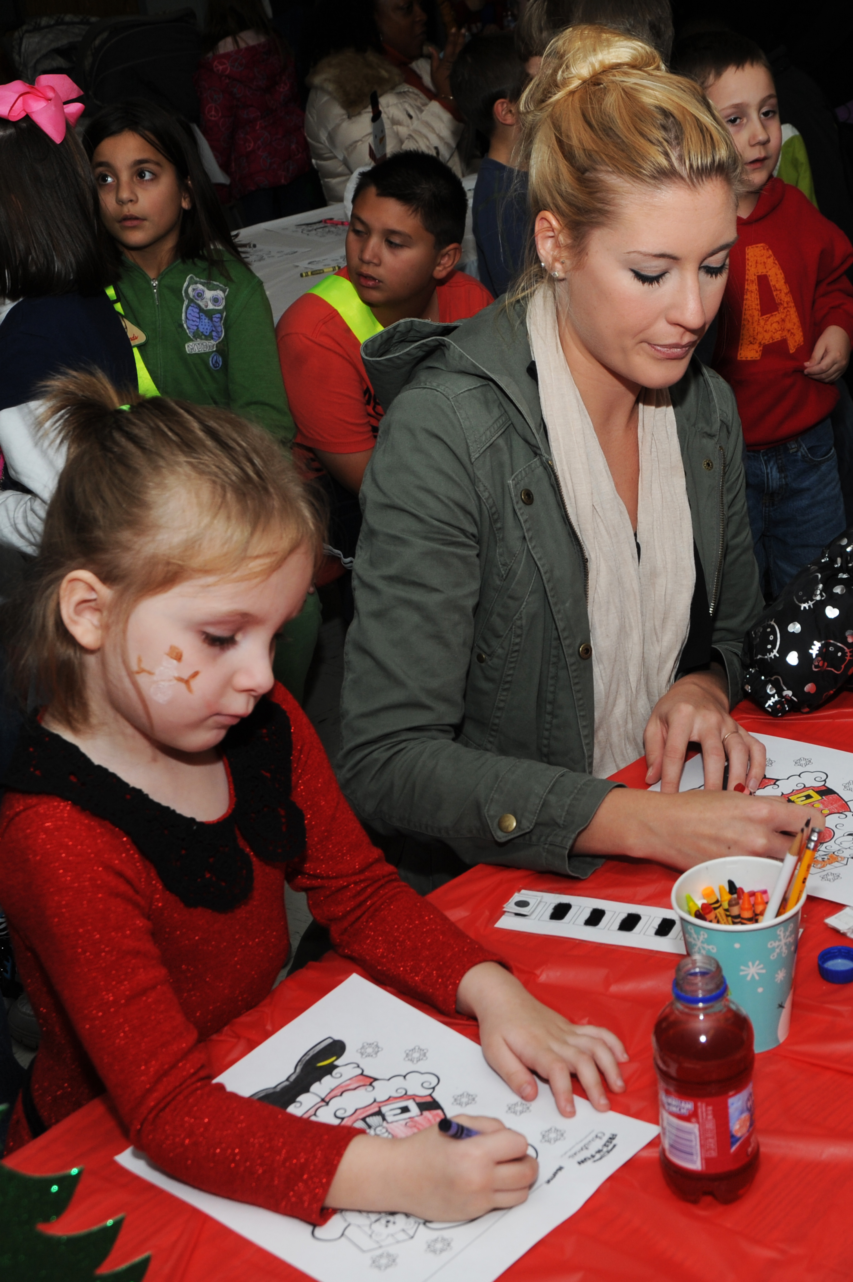 Aurora Liddle and her teacher, Kate Milo color an activity sheet with crayons at the Scott Elementary School Dec. 13. The children got to snack on cookies and juice, get their face painted, watch Polar Express, color and fill out activity sheets, meet Santa and Christmas shop for their families. (U.S. Air Force photo/Airman 1st Class Megan Friedl)