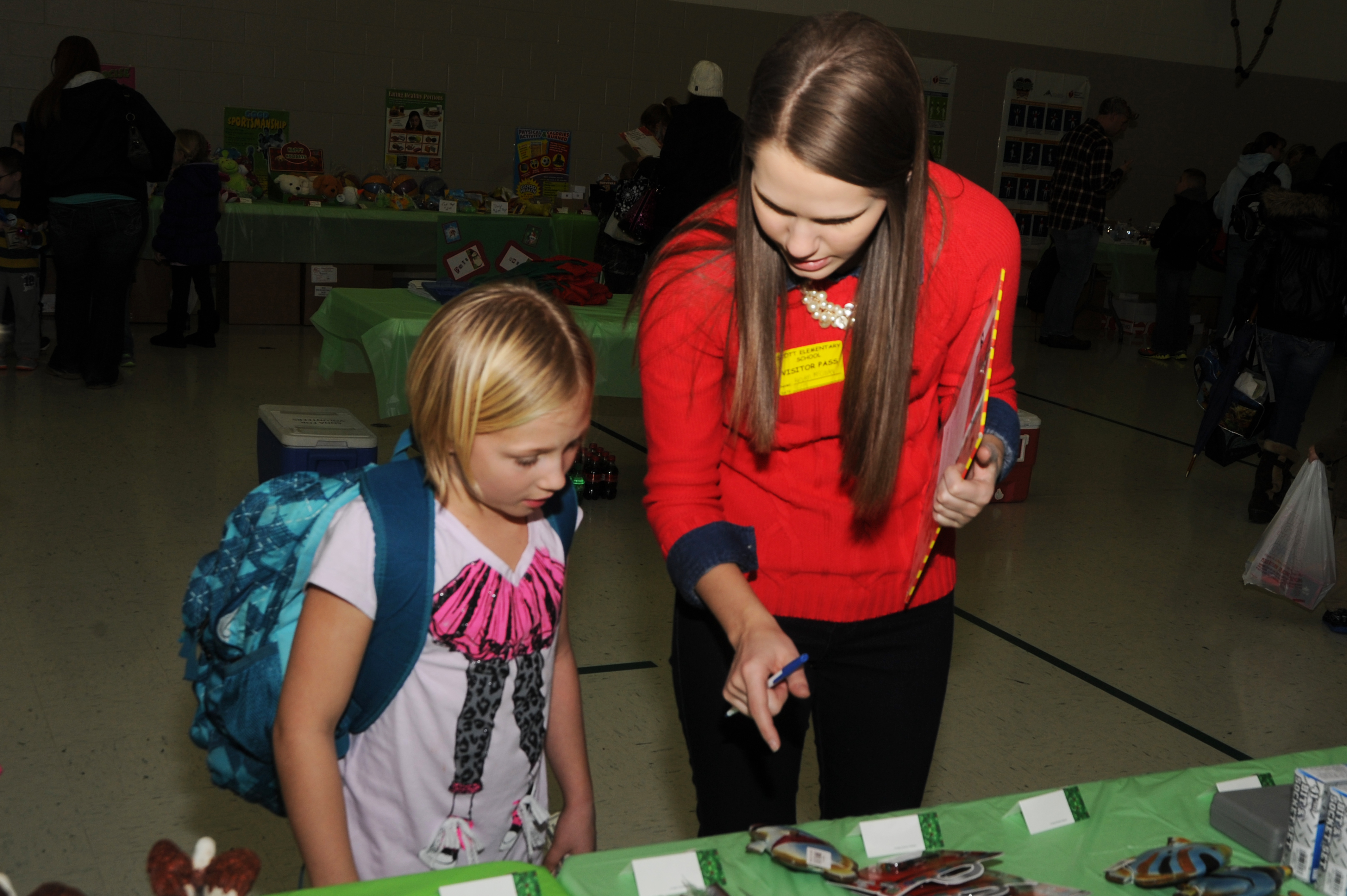 Kristen McCalauley, a volunteer helps Emma Gregory pick out presents at the Scott Elementary School Dec. 13. Gregory picked a variety of gifts to give to her parents and siblings. (U.S. Air Force photo/Airman 1st Class Megan Friedl)