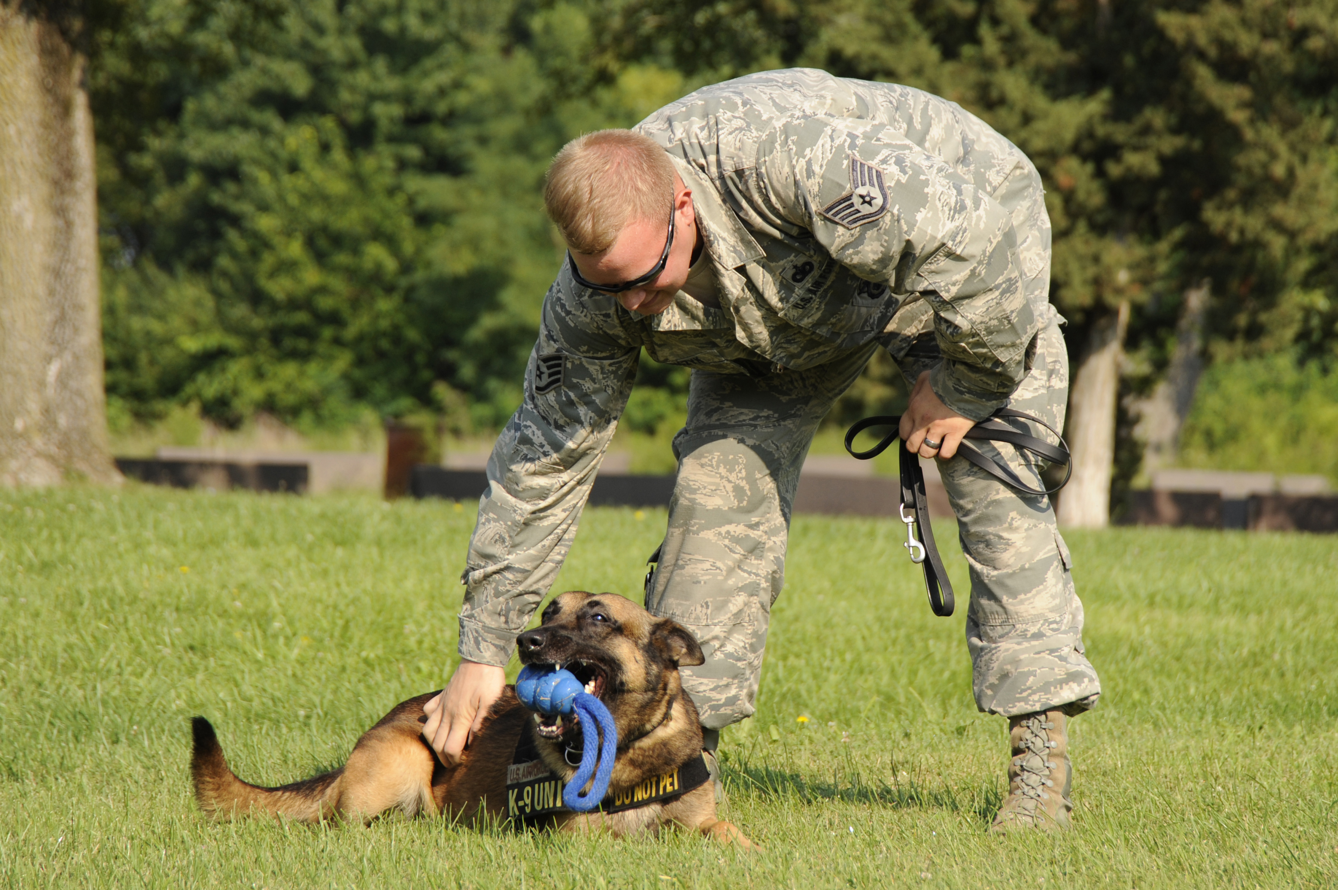 Staff Sgt. David Yaronczyk, 375th Security Forces Squadron military working dog handler, plays with Breston after successfully completing a training exercise at the K-9 kennels Aug. 19, 2013, Scott Air Force Base, Ill. The bite suit provides protection from being bitten and helps teach the K-9's where to take down suspects. (U.S. Air Force photo/Staff Sgt. Christopher Boitz)