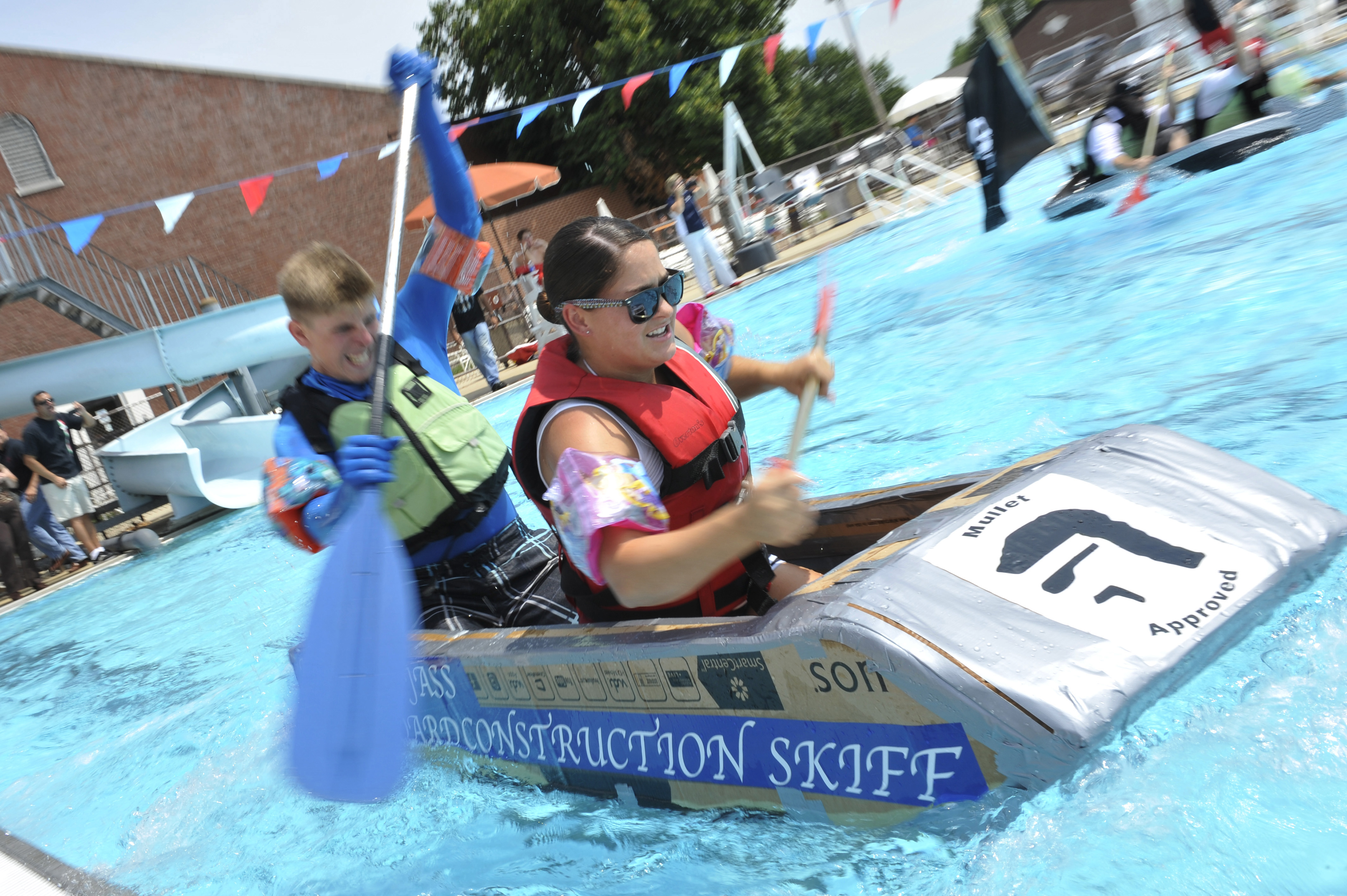Members from Team Scott participate in the 3rd annual Cardboard Boat Regatta at the Scott pool Aug. 2, 2013. The race, hosted by the 375 Force Support Squadron, featured 23 teams and gave away prizes for best decorated boat, fastest sinking boat and best dressed contestants. Gift cards were also given to the first, second and third place winners. (U.S. Air Force photo/Staff Sgt. Christopher Boitz)