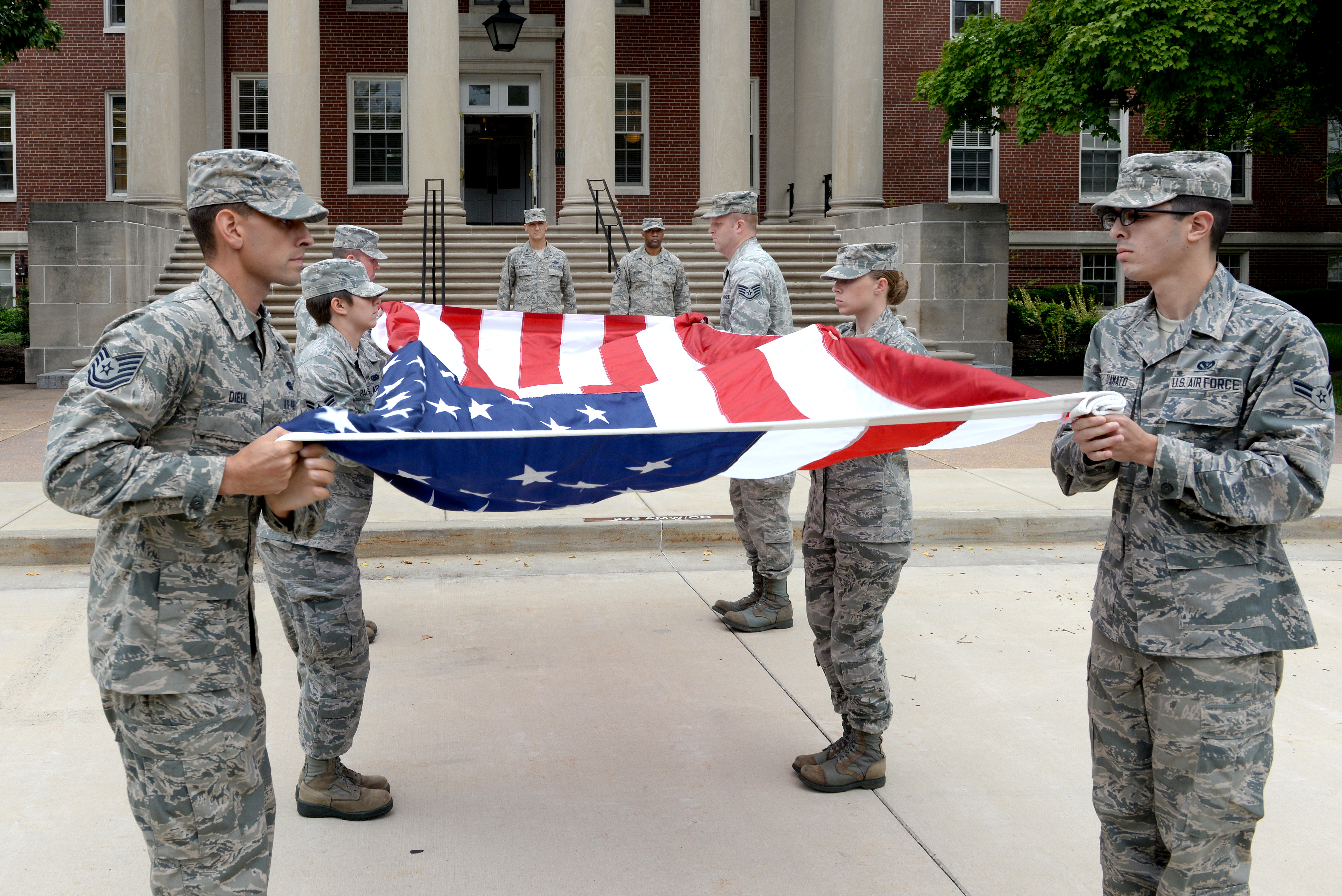 Members of the base honor guard fold the flag during the 9/11 retreat ceremony held at the 375th Air Mobility Wing headquarters building Sept. 11, 2014 at Scott Air Force Base, Ill. The ceremony was held in honor of the heroes of 9/11 and those who lost their lives that day. (U.S. Air Force photo/ Airman 1st Class Kiana Brothers)