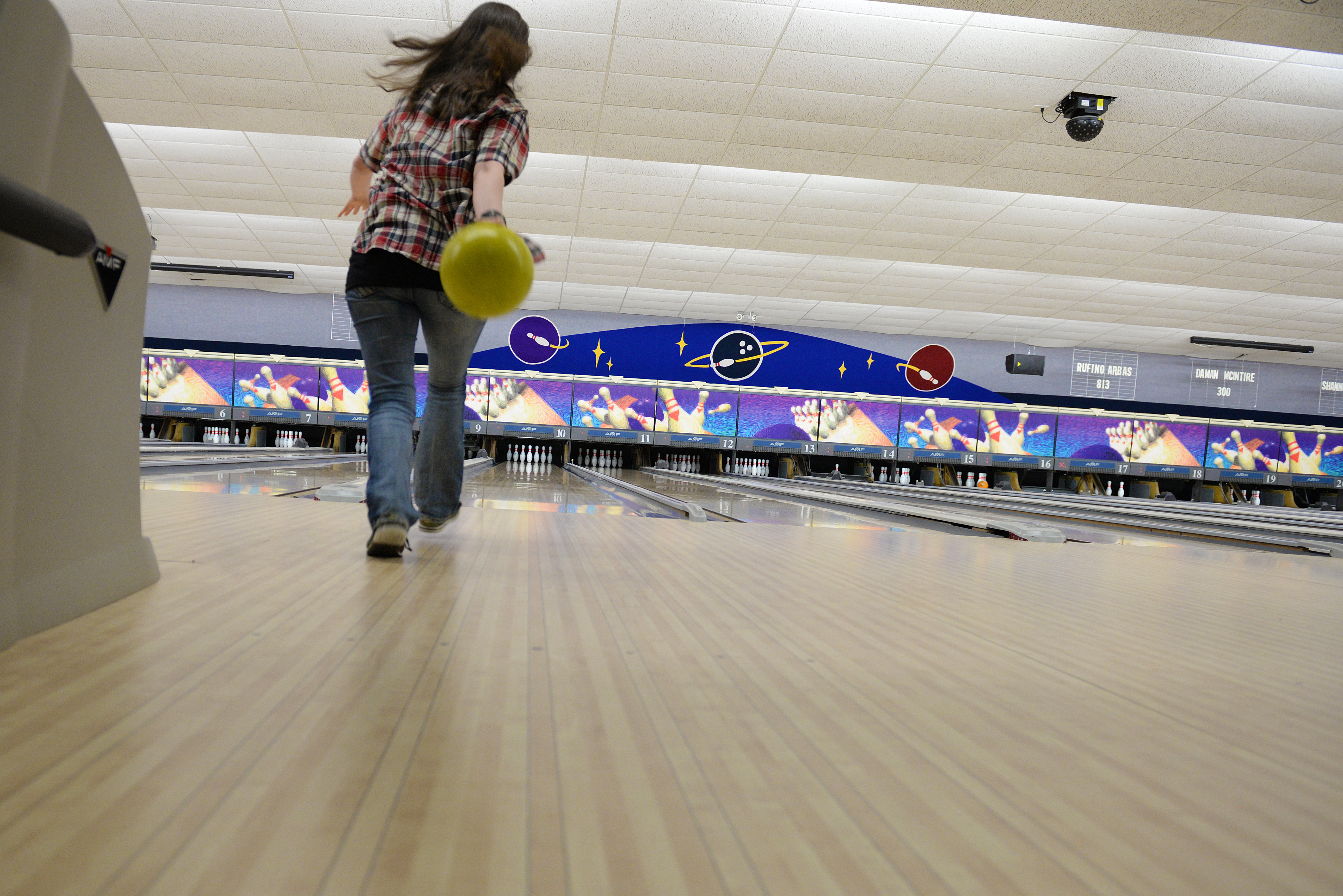 Airman 1st Class Kimberly O’Brien, a bowler during the first Sexual Assault Prevention and Response Bowl-a-thon, approaches a bowling lane to strike the pins, Scott Air Force Base, Ill., Feb. 12, 2015. The day consisted of shifts of teams playing a few games each. (U.S. Air Force photo by Airman 1st Class Erica Crossen)