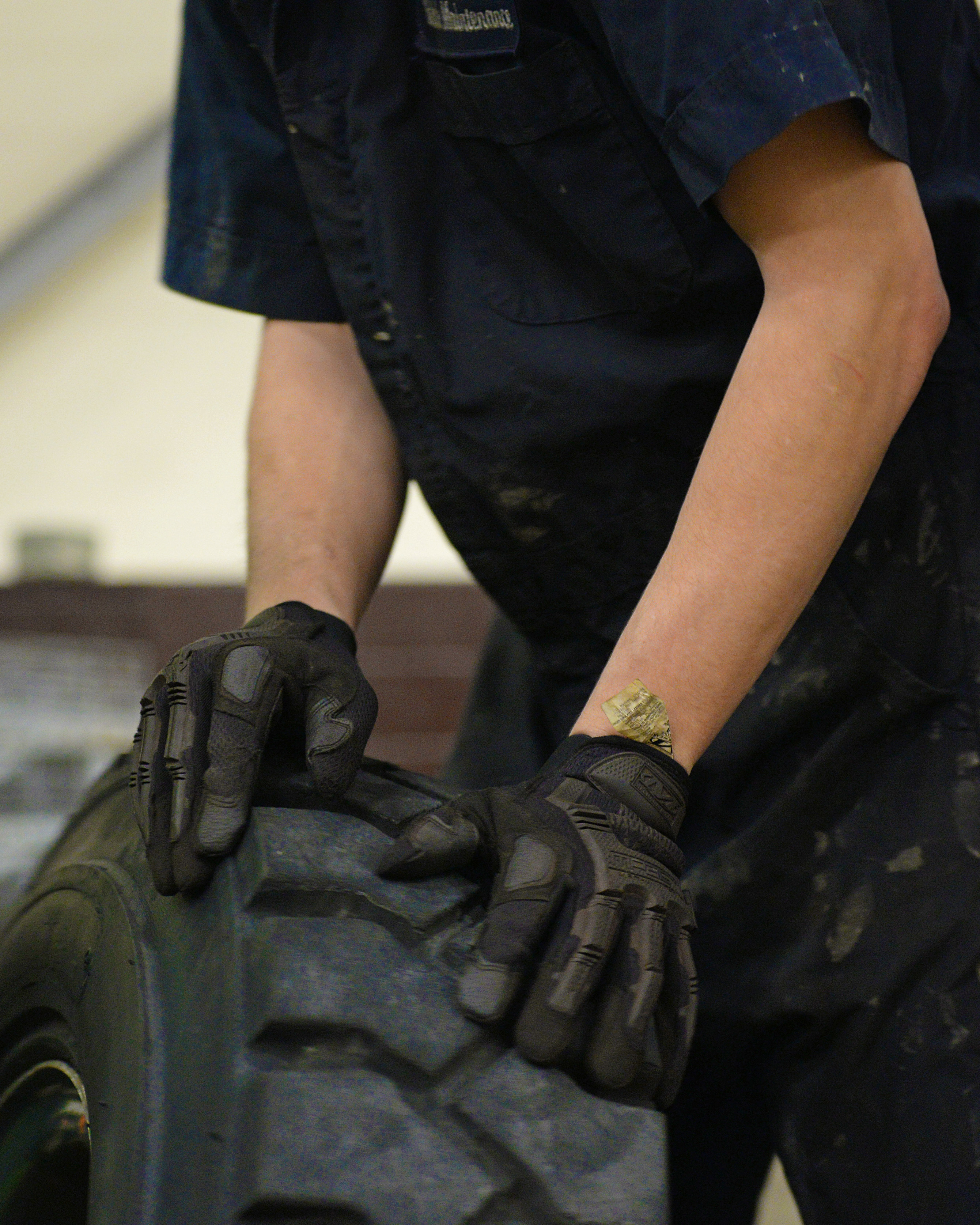 Airman 1st Class Zackary Wilkinson, 375th Logistics Readiness Squadron vehicle maintainer, rolls a tire to a forklift that is being repaired, Scott Air Force Base, Ill., Jan. 21, 2015. Vehicle Maintainers work with a variety of vehicles, from flightline support vehicles to fuel trucks. (U.S. Air Force photo by Airman 1st Class Erica Crossen)