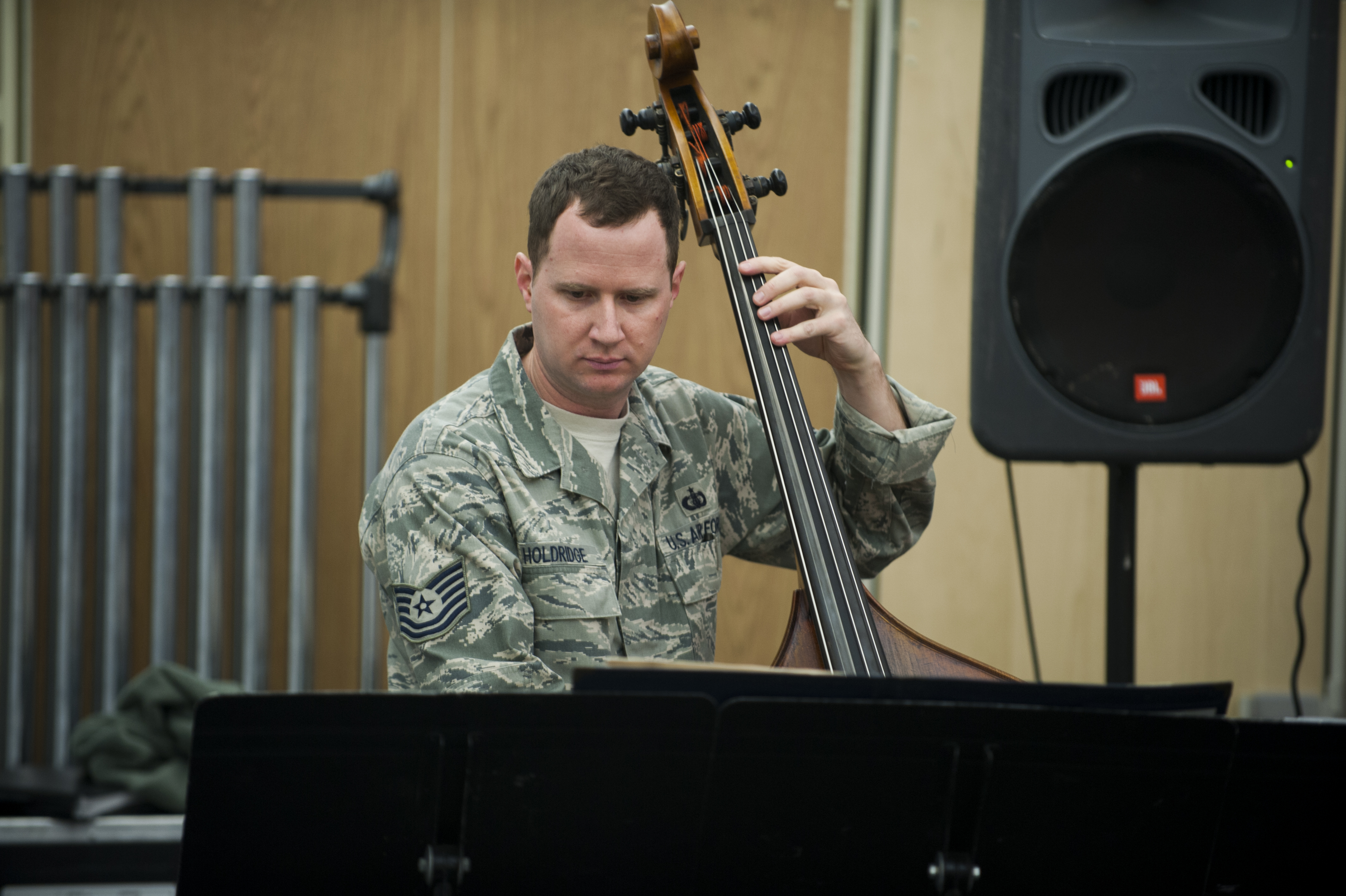 Tech. Sgt. Joshua Holdridge, Band of Mid-America bassist, rehearses with the Shades of Blue ensemble Jan. 28, 2015, at Scott Air Force Base, Ill. Band members rehearse several times a week to prepare for their performances. (U.S. Air Force photo by Staff Sgt. Clayton Lenhardt/Released)