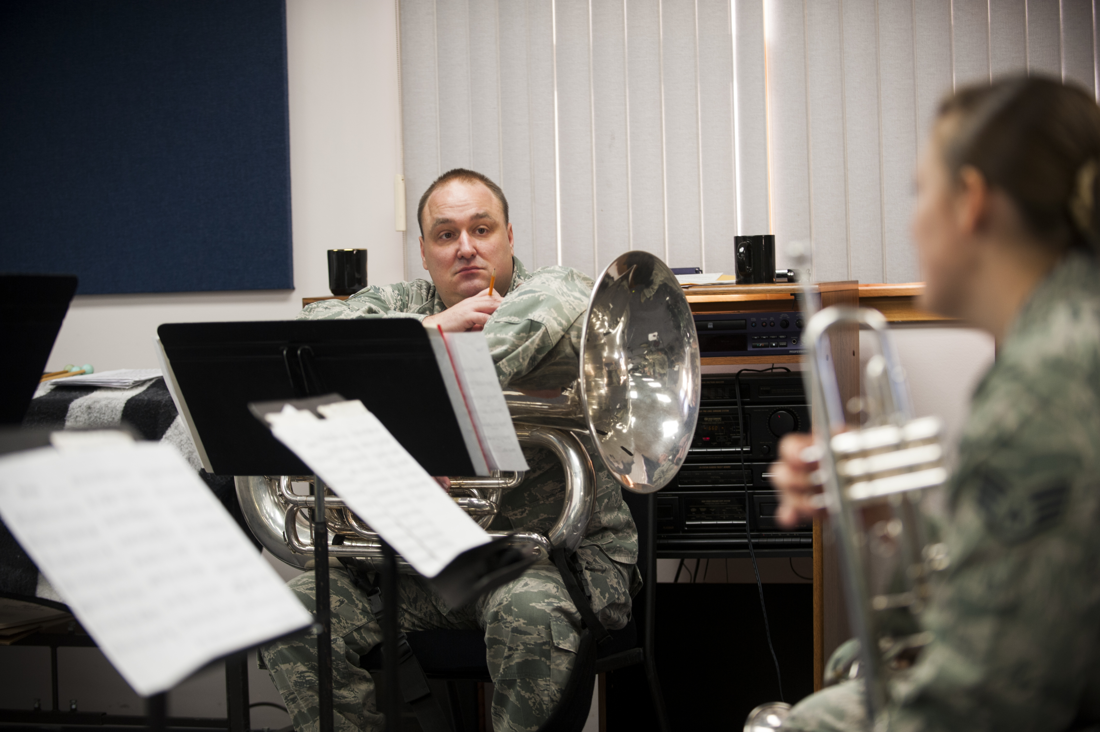 Tech. Sgt. Matthew Kuebler, Band of Mid-America tubist, offers feedback during a rehearsal session with Airlifter Brass Jan. 28, 2015, at Scott Air Force Base, Ill. Air Force bands entertain the American public and promote esprit de corps within the military. (U.S. Air Force photo by Staff Sgt. Clayton Lenhardt/Released)