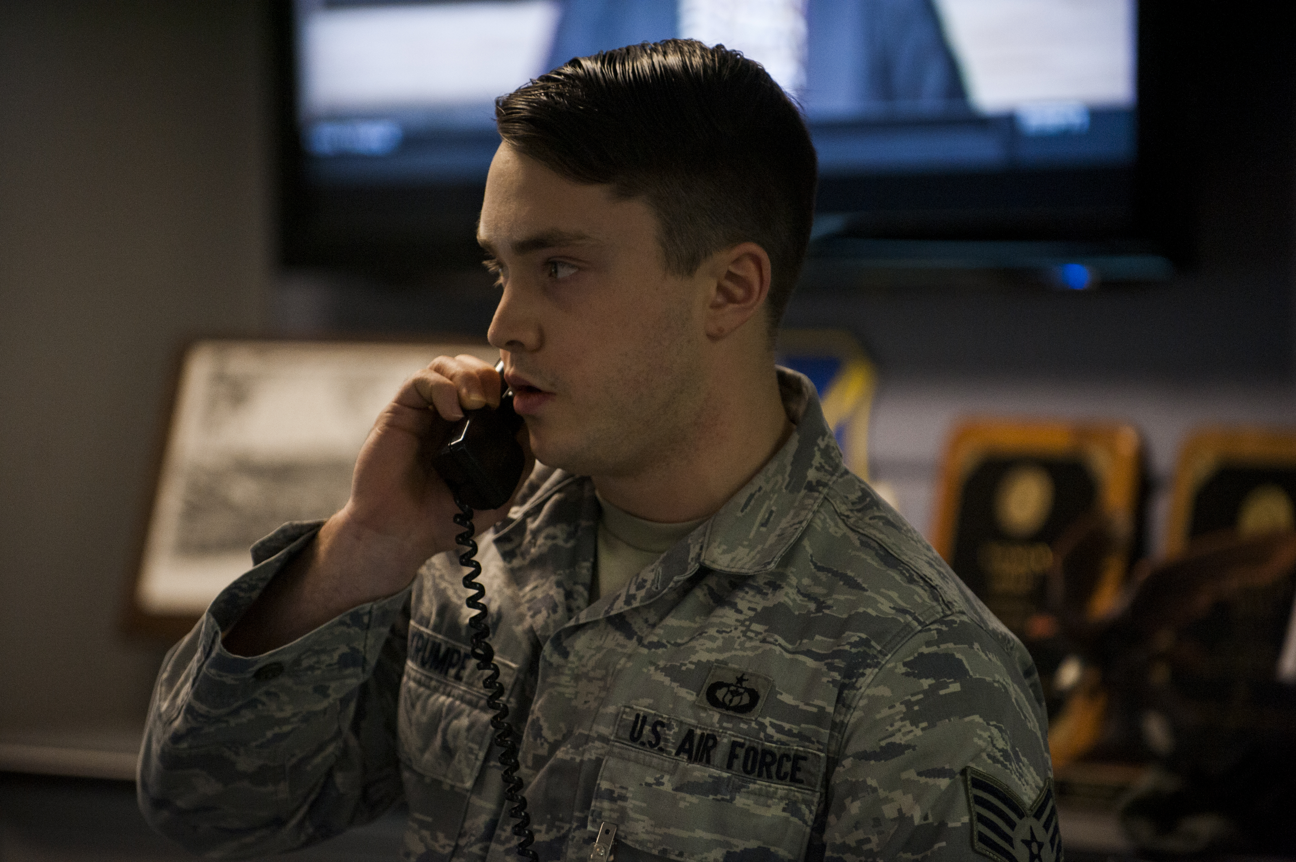 Staff Sgt. Benjamin Krumpe, 618th Air Operations Center weather forecaster, reports a suspicious package during an exercise Feb. 20, 2015, at Scott Air Force Base, Ill. This exercise tested the wing’s ability to respond to a threat at a tenant unit. (U.S. Air Force photo by Staff Sgt. Clayton Lenhardt/Released)