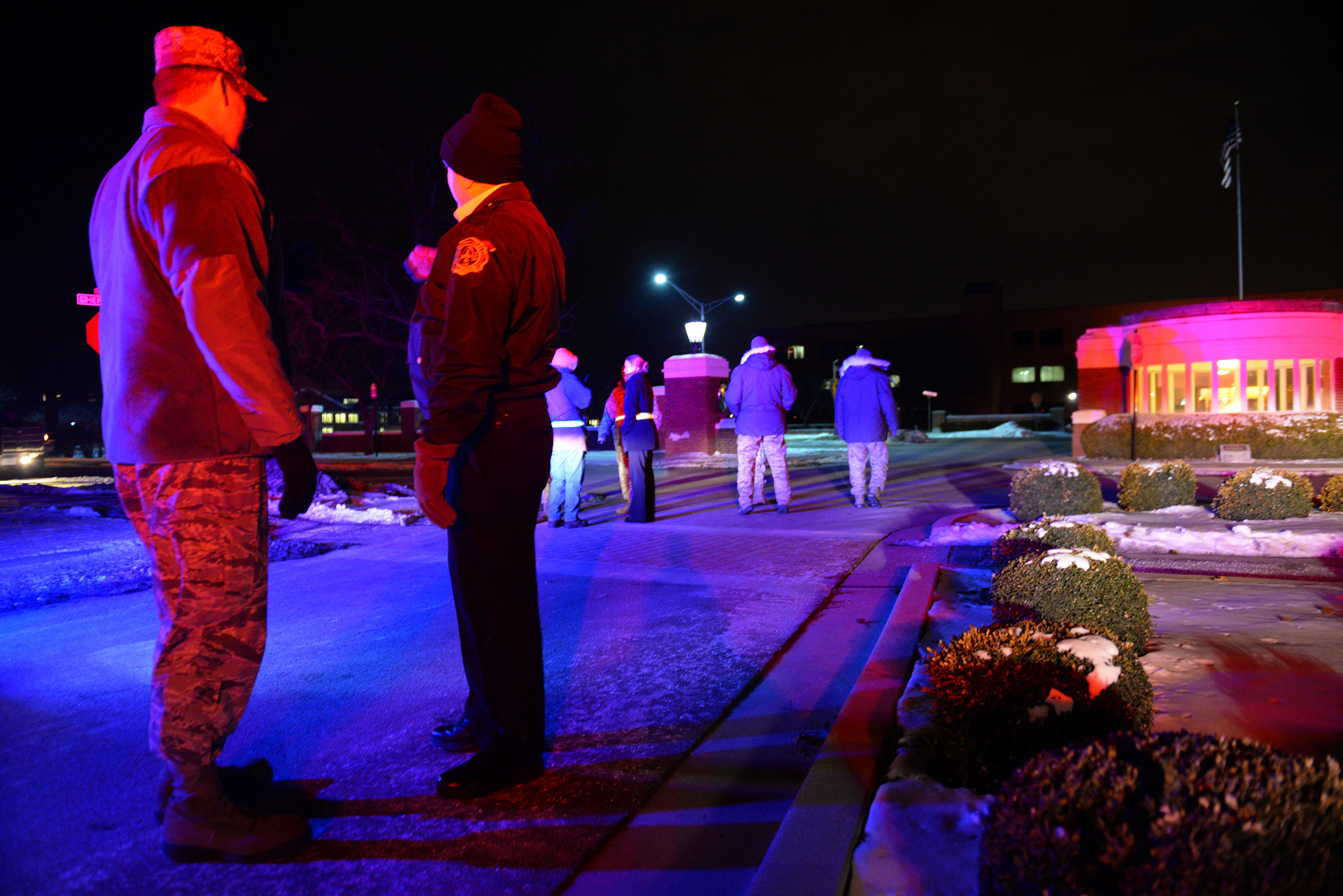 Members of the 375th Security Forces Squadron respond to an exercise, Scott Air Force Base, Ill., Feb. 19, 2015. The exercise was meant to exercise the training 618th Air Operations Center headquarters members have learned for operational security and training for the 375th Air Mobility Wing personnel supporting a tenant unit. (U.S. Air Force photo by Airman 1st Class Erica Crossen)