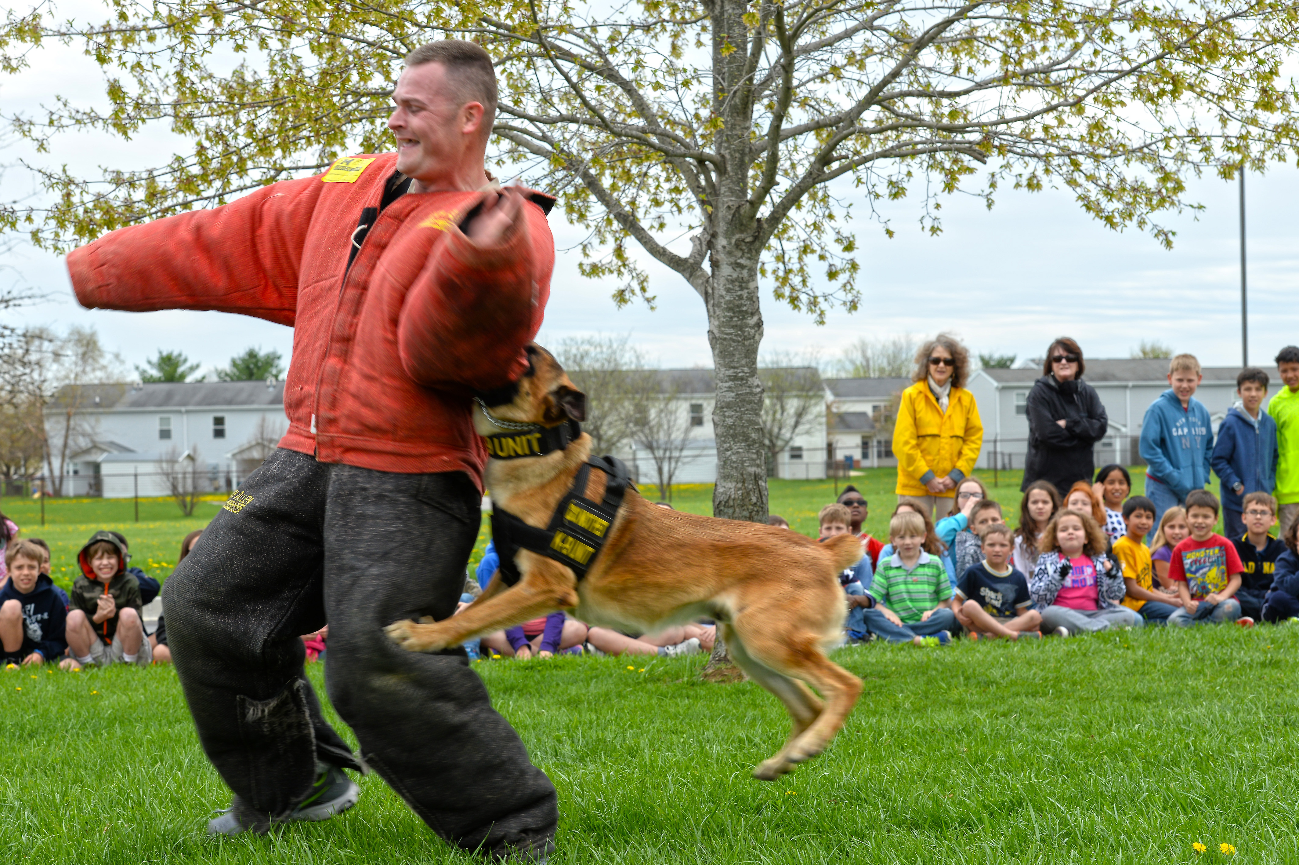 Staff Sgt. William Watson, 375th Security Forces Squadron military working dog handler, wears a bite suit during a demonstration for the Month of the Military Child April 14, 2015 at Scott Air Force Base, Illinois. The demonstration helped with public relations between K-9s and their handlers while showing kids what the K-9's are trained to do. (U.S. Air Force photo/Senior Airman Tristin English)