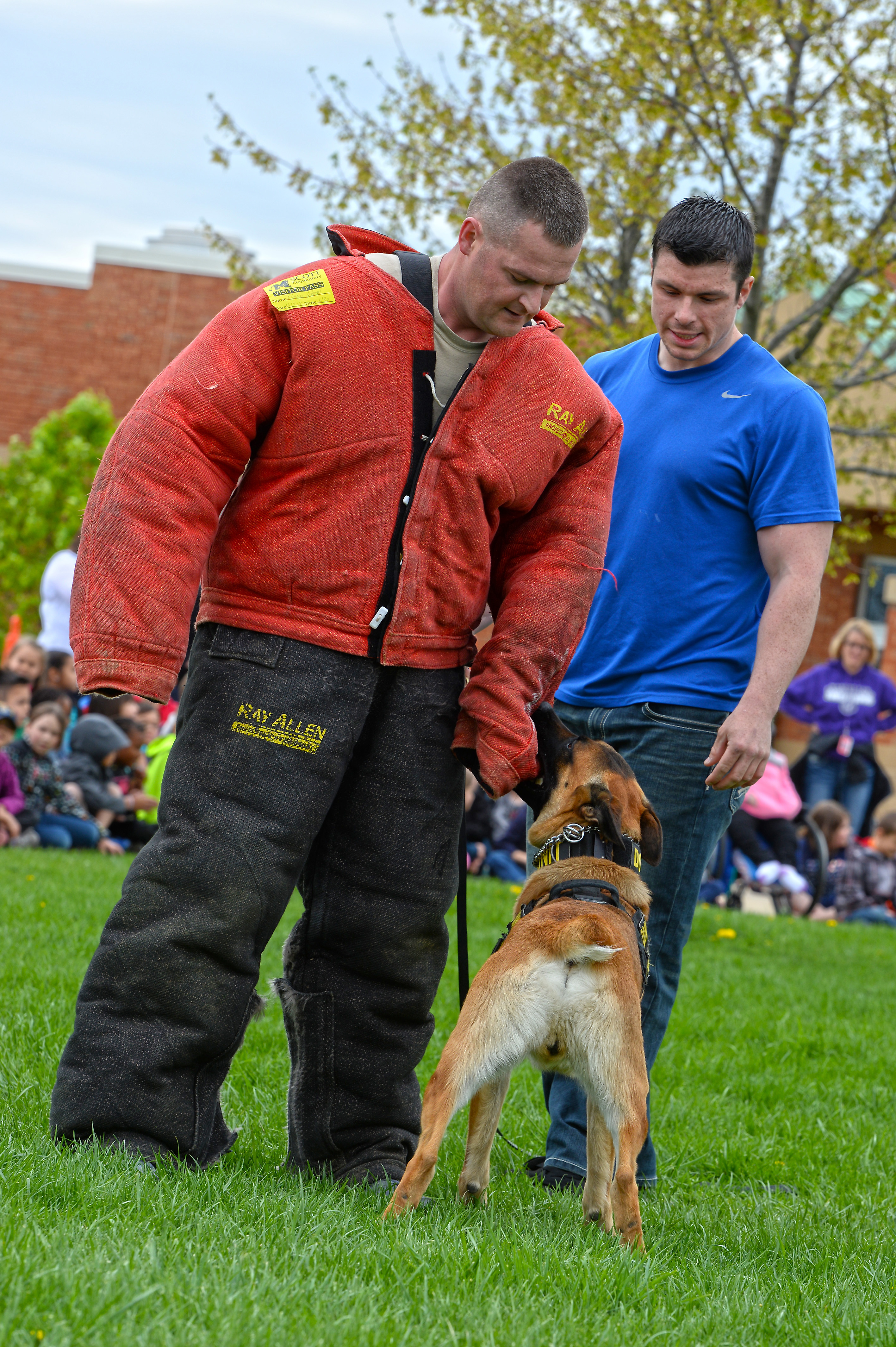Staff Sgt. James Matheson, 375th Security Forces Squadron military working dog handler, gives commands to military working dog Rromesha during a demonstration for the Month of the Military Child April 14, 2015 at Scott Air Force Base, Illinois. Kids were informed on how the K-9's are trained to find explosives, drugs and how the K-9's take down a suspect. (U.S. Air Force photo/Senior Airman Tristin English)