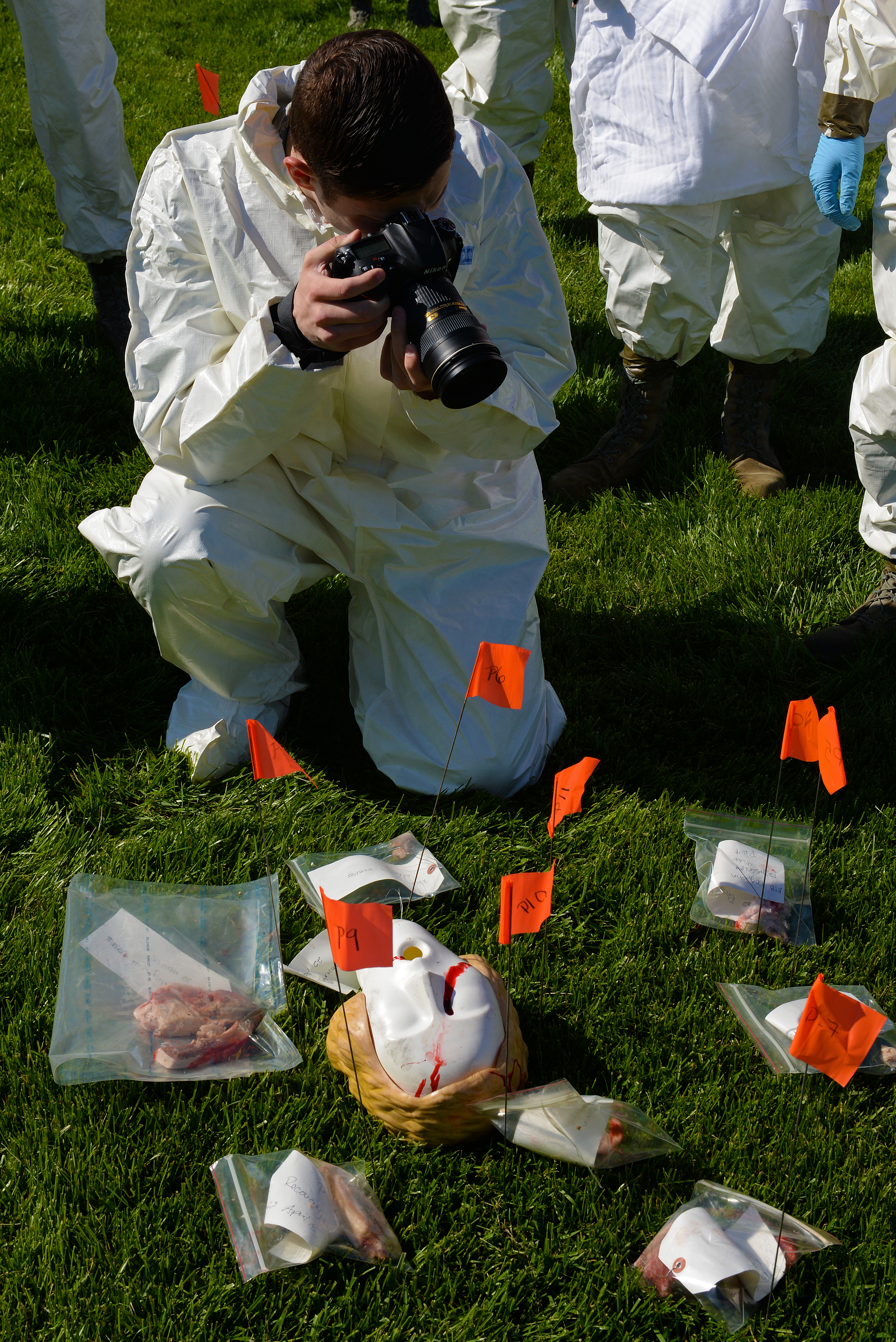 Senior Airman Jake Eckhardt, 375th Air Mobility Wing Photojournalist, documents simulated casualties and evidence found by search and recovery personnel during an exercise at Scott Air Force Base, Illinois, April 23, 2015. The photos can then be used by the investigating authority to help determine the cause of the incident to resolve the investigation. (U.S. Air Force photo by Airman 1st Class Erica Crossen)