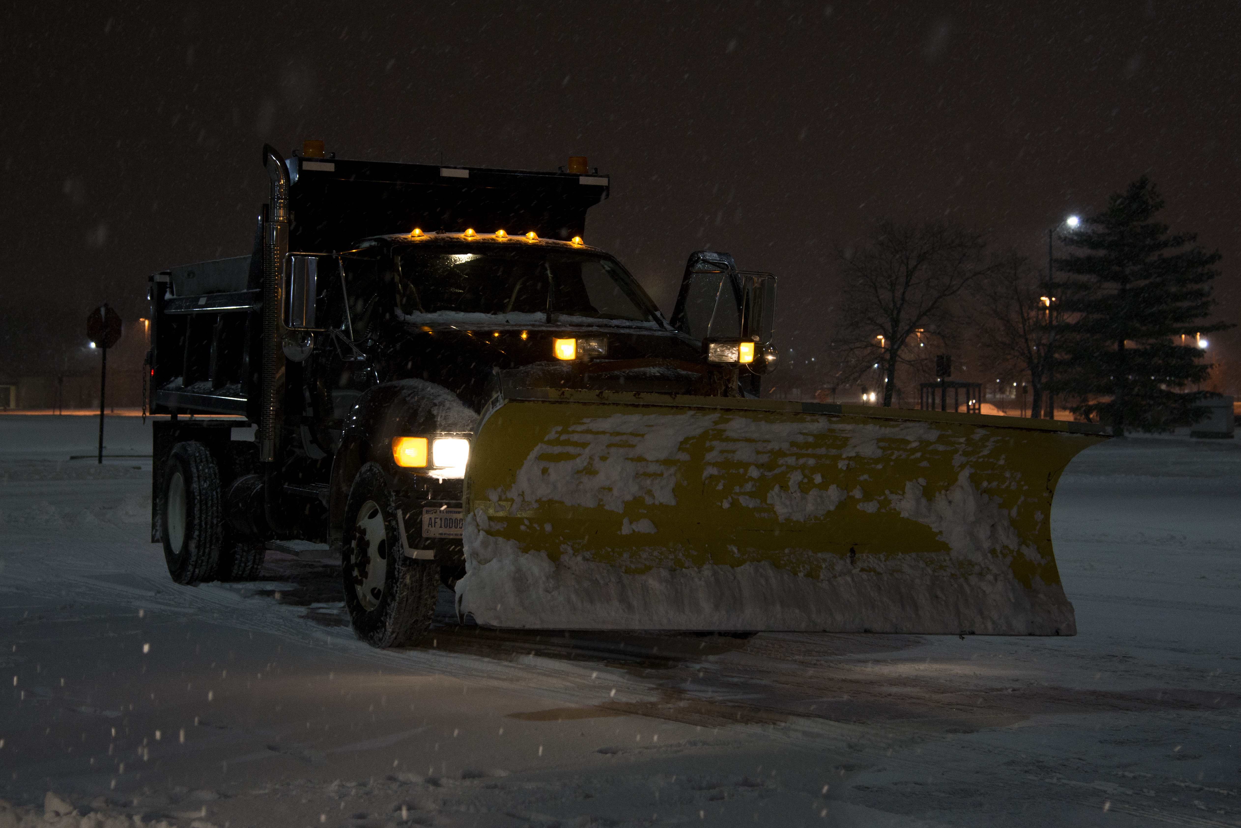 Members of the Civil Engineering Squadron plow the commissary parking lot January 19, 2016 at Scott Air Force Base, Illinois. The 375th AMW leadership does its best to track changing weather, monitor on- and off-base road conditions, and balance safety with mission accomplishment. With the rapid changing and difficult-to-predict weather conditions in the Midwest, the base strives to announce base closures and to report delays in advance so employees can plan ahead. (U.S. Air Force by Airman Gwendalyn Smith)