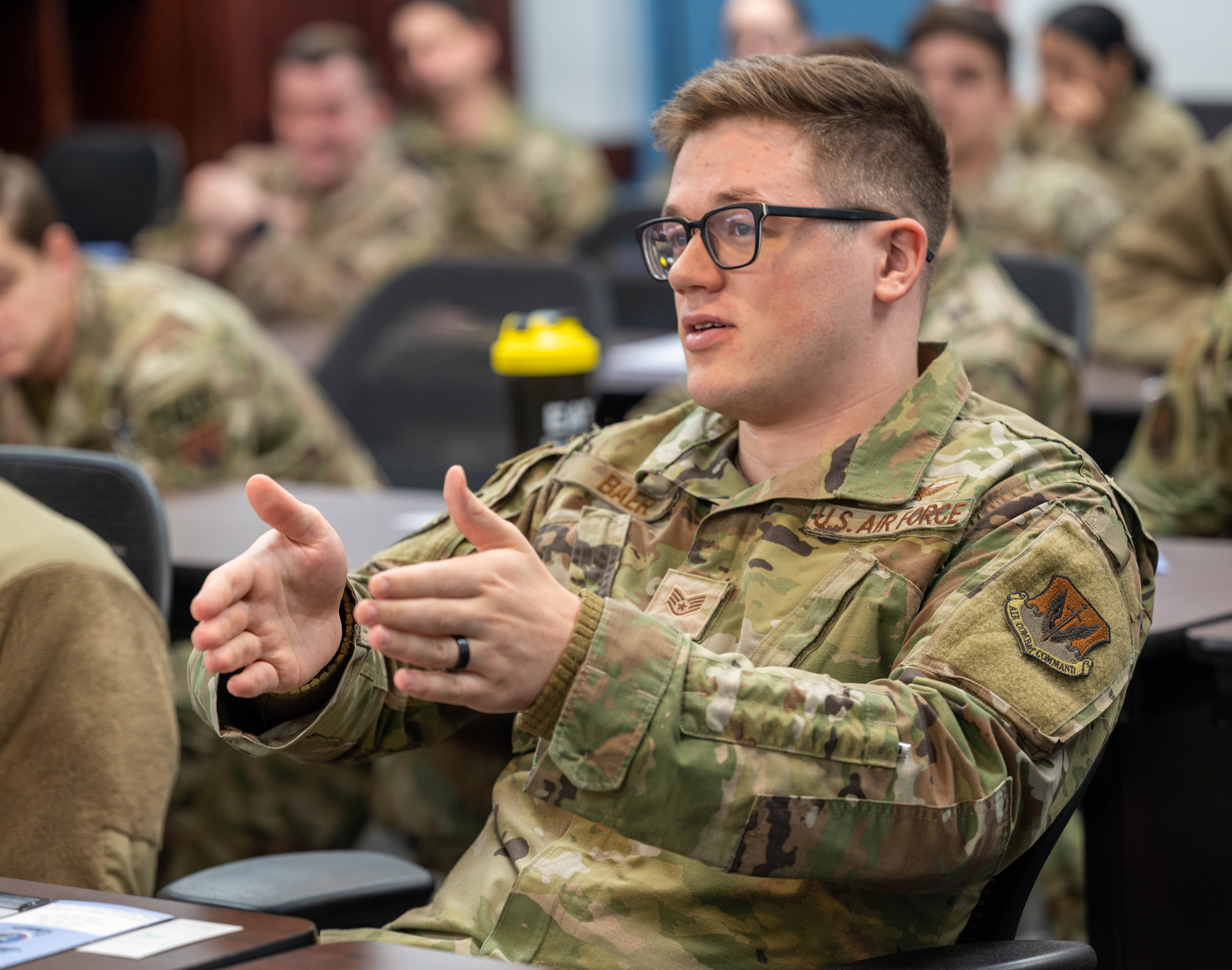 U.S. Air Force Staff Sgt. Jacob Baer, 835th Cyber Operations Squadron cyberware operator, provides feedback during a lecture on Scott Air Force Base, Illinois, Feb. 8, 2023. Baer enrolled in the Airman Leadership School to learn how to be an effective supervisor. (Photo by Airman 1st Class Shelby Rapert)
