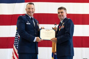 June 24, 2022 375th Medical Group Change of Command U.S. Air Force Col. Raymond Clydesdale, 375th Medical Group commander, assumes command of the 375th MDG after receiving the guidon from Col. Chris Robinson, 375th Air Mobility Wing commander, on Scott Air Force Base, Illinois, June 23, 2022. As a chief flight surgeon, Clydesdale has flown 775 hours